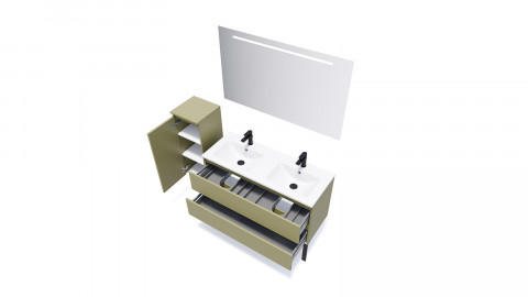 En stock• Ensemble Meuble, double vasque intégrée, miroir et colonne• Couleur du meuble : vert olive• Finition du meuble : mat• Poignées doré brossé• Vasque en céramique - blanc brillant• Nombre de tiroirs : 2 - Les tiroirs sont équipés du système softclose• Demi-colonne 1 porte - ouverture à gauche• Dimensions du meuble de salle de bain : 120 x 43,5 x 56 cm• 2...