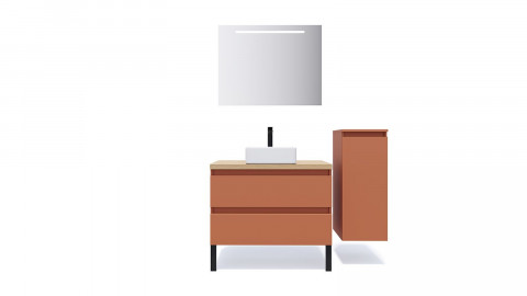 En stock• Ensemble Meuble, vasque à poser, miroir et colonne• La gamme «sans-poignée»• Couleur du meuble : terracotta• Finition du meuble : Mat• Plan de toilette stratifié couleur chêne clair• Vasque carrée en céramique - Blanc brillant• Nombre de tiroirs : 2 - Les tiroirs sont équipés du système softclose• Demi-colonne 1 porte - 2 tablettes de rangement -...
