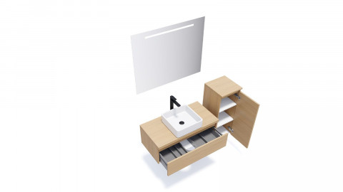 Ce meuble présente des dimensions idéales : 90 x 43,5 x 28 cm pour le meuble principal, une colonne avec 2 tablettes de 35 x 35 x 86 cm qui s'ouvre vers la droite, une vasque de 38 x 38 cm avec une hauteur de 13 cm, et un plan de toilette de 90 x 46 cm d'une épaisseur de 39 mm, lui permettant de s'intégrer harmonieusement dans tous les intérieurs.