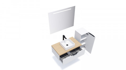 • Meuble de salle de bain avec vasque à poser carrée, miroir LED et demi colonne