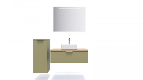 En stock• Meuble de salle de bain avec vasque à poser carrée, miroir LED et demi colonne • Meubles à suspendre par boitiers de suspensions invisibles et réglables en 3 dimensions • Couleur du meuble : vert olive • Finition du meuble : Mat • Plan de toilette stratifié couleur chêne clair • Vasque carrée en céramique - Blanc brillant • Nombre de tiroirs : 2 - Les...