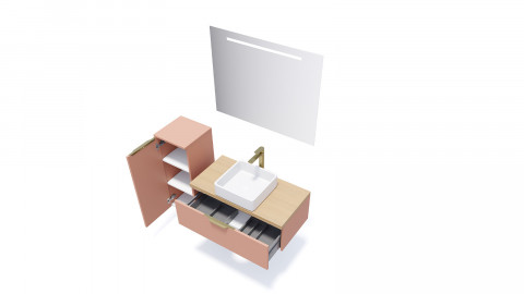 • Ensemble Meuble, vasque à poser, miroir et colonne• Couleur du meuble : terracotta• Finition du meuble : mat• Poignées : doré brossé• Plan de toilette stratifié couleur• Vasque carrée en céramique - Blanc brillant• Nombre de tiroirs : 1 - Les tiroirs sont équipés du système softclose• Demi-colonne 1 porte - ouverture à droite• Dimensions du meuble de...