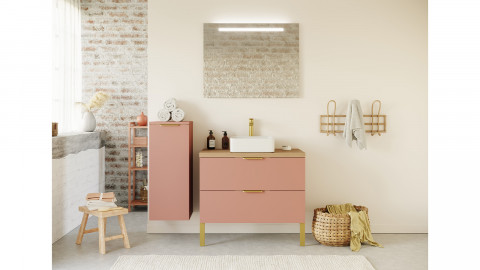 En stock• Ensemble Meuble, vasque à poser, miroir et colonne• Couleur du meuble : terracotta• Finition du meuble : mat• Poignées : doré brossé• Plan de toilette stratifié couleur chêne clair• Vasque carrée en céramique - Blanc brillant• Nombre de tiroirs : 1 - Les tiroirs sont équipés du système softclose• Demi-colonne 1 porte - ouverture à gauche• Dimensions du...
