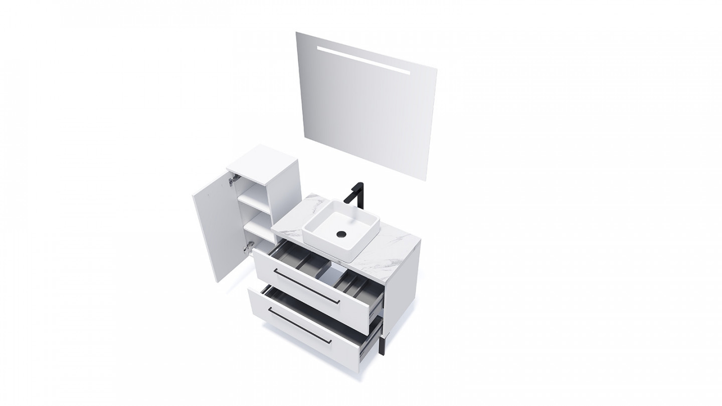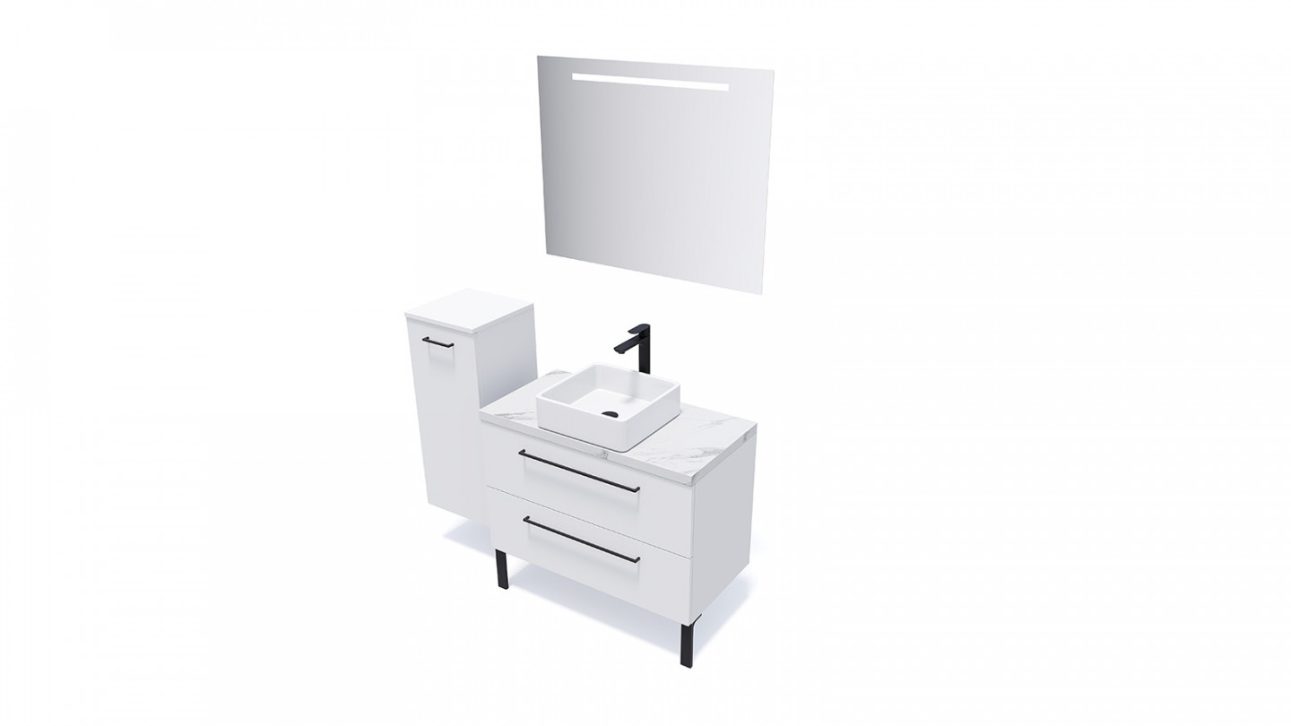 En stock• Ensemble Meuble, Vasque à poser et miroir• Couleur du meuble : blanc• Finition du meuble : mat• Poignées doré brossé• Plan de toilette stratifié couleur• Vasque carrée en céramique - Blanc brillant• Nombre de tiroirs : 1 - Les tiroirs sont équipés du système softclose• Dimensions du meuble de salle de bain : 90 x 43,5 x 28 cm• Dimensions de la vasque :...