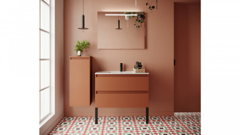En stock• Ensemble Meuble, vasque à poser, miroir et colonne• La gamme «sans-poignée»• Couleur du meuble : terracotta• Finition du meuble : Mat• Plan de toilette stratifié couleur chêne clair• Vasque carrée en céramique - Blanc brillant• Nombre de tiroirs : 2 - Les tiroirs sont équipés du système softclose• Demi-colonne 1 porte - 2 tablettes de rangement -...