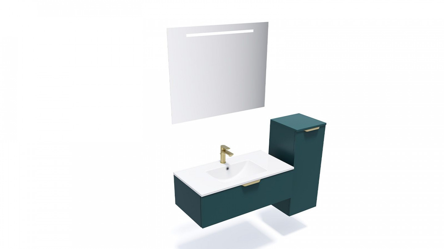 En stock• Meuble de salle de bain avec vasque intégrée, miroir LED et demi-colonne • Meubles à suspendre par boitiers de suspensions invisibles et réglables en 3 dimensions • Couleur du meuble : vert olive • Finition du meuble : Mat • Vasque en plan composite - blanc brillant • Nombre de tiroirs : 2 - Les tiroirs sont équipés du système softclose • Demi-colonne 1...