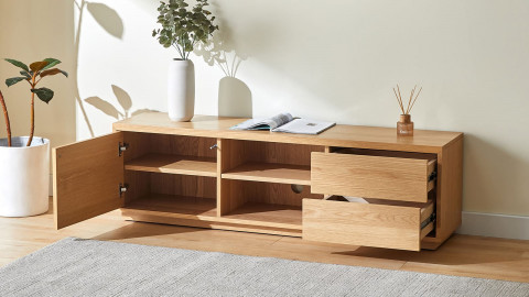 En stock•Meuble TV•Couleur :Naturel•Dimensions totales : H 52 x L 133 x P 45 cm•Dimensions des 4 compartiments : H 19,5 x L 63,8 x P 39,2 cm•Hauteur des étagères : 8 cm•Matière : Placage de chêne certifié FSC•Livré en 2 colis