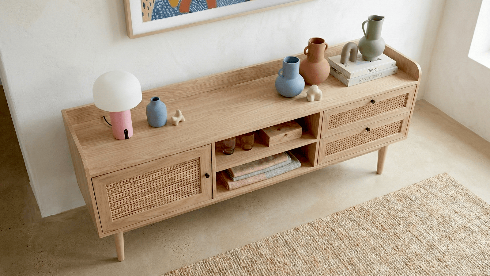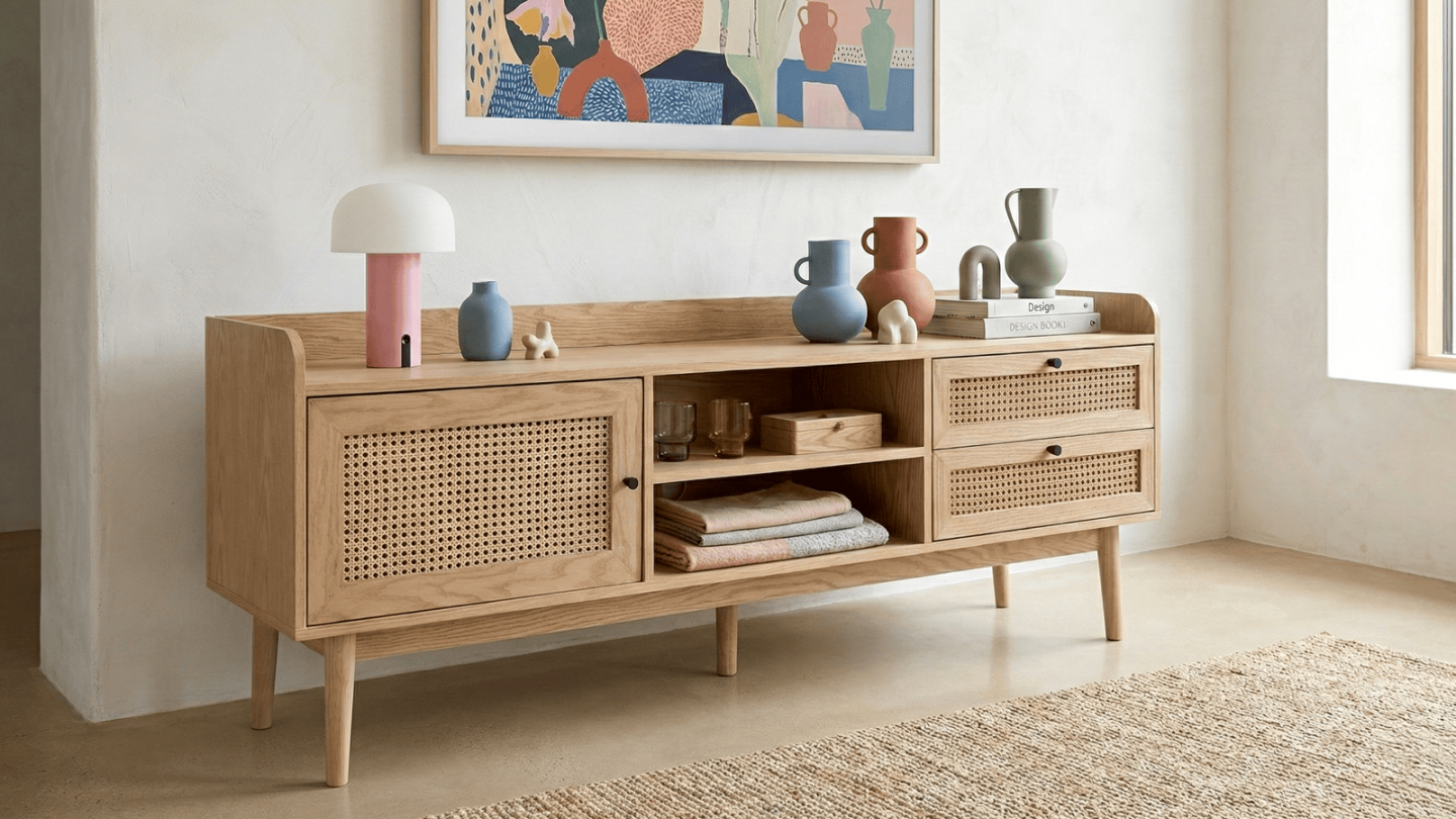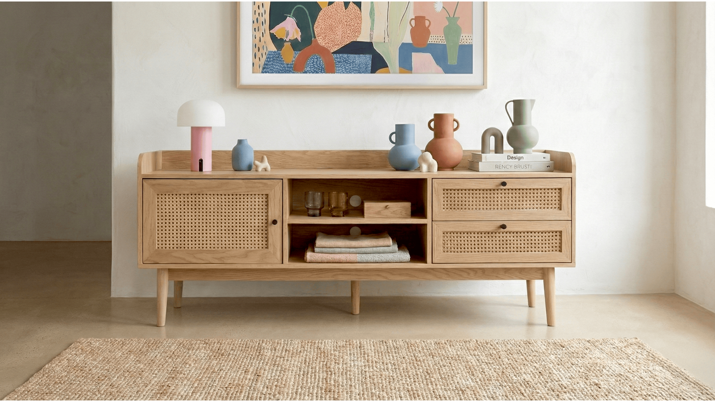 Le meuble TV en cannage naturel et chêne naturel marie élégance et praticité pour créer un espace de divertissement sophistiqué. Ses matériaux de qualité et son design raffiné en font un ajout exceptionnel à votre espace de vie. Profitez de la beauté naturelle et de la fonctionnalité avec ce meuble TV en cannage et chêne.