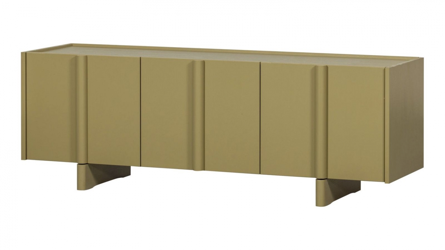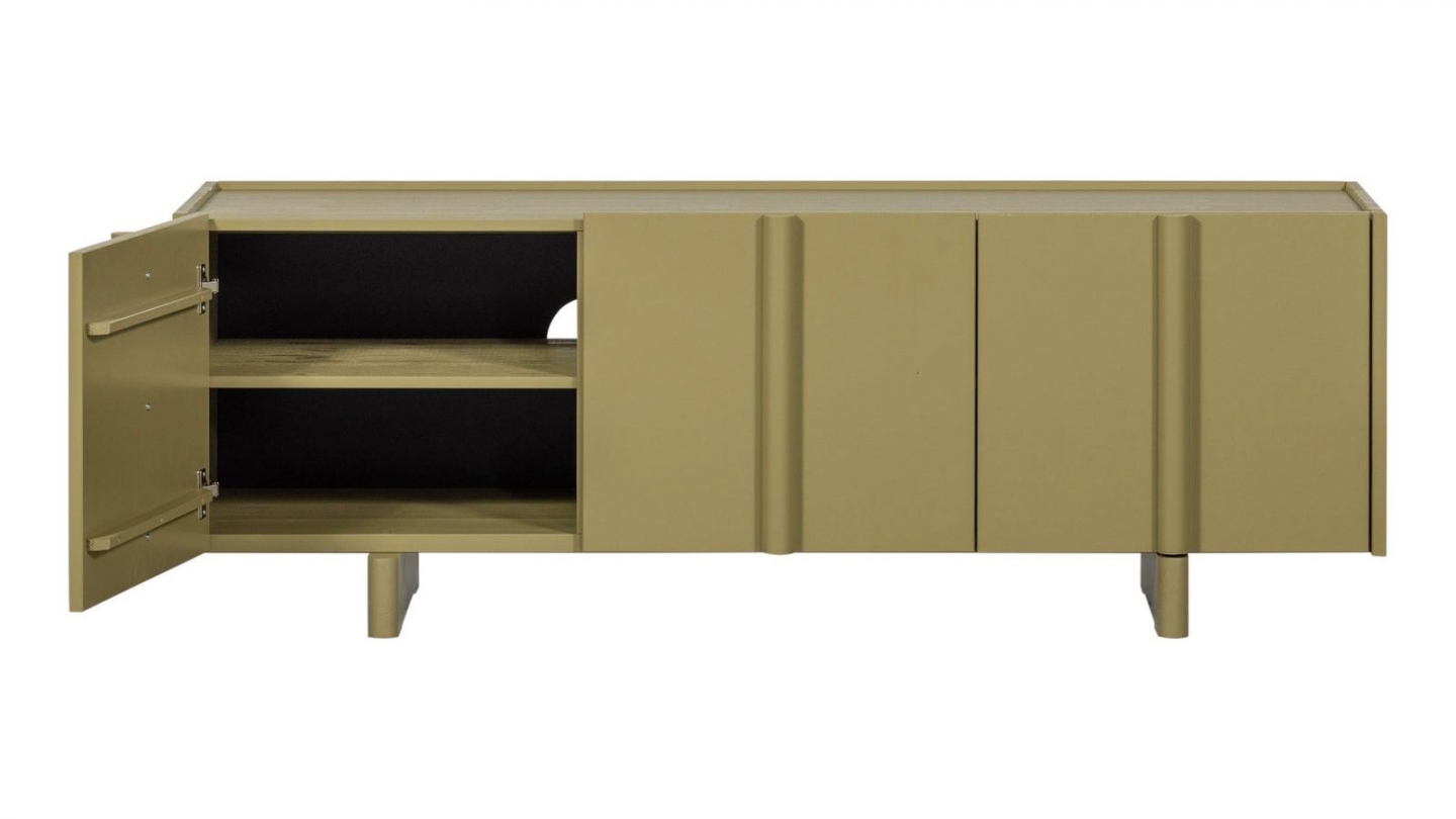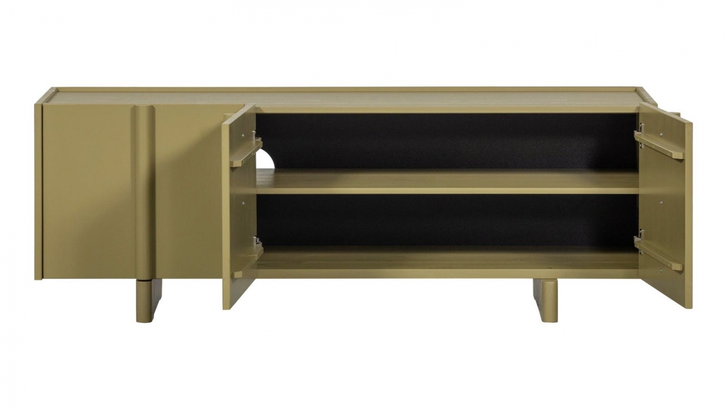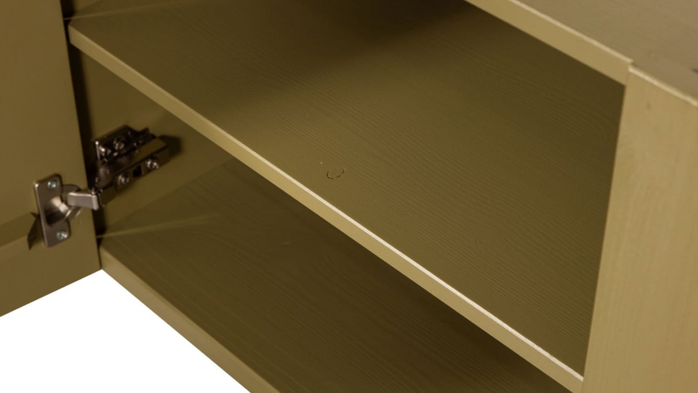 Meuble TV - Macha • Matière de la structure : Pin massif • Finition : Corps de meuble en bois peint. Plateau supérieur couleur bois. • Couleur : Vert kaki • Finition des tiroirs : Vert kaki • Finition des portes : Vert kaki • Piètement en Pin massif couleur vert kaki - hauteur 7 cm • Poignées : Métal vieilli • Rangements : 2 portes semi-vitrées, 2...