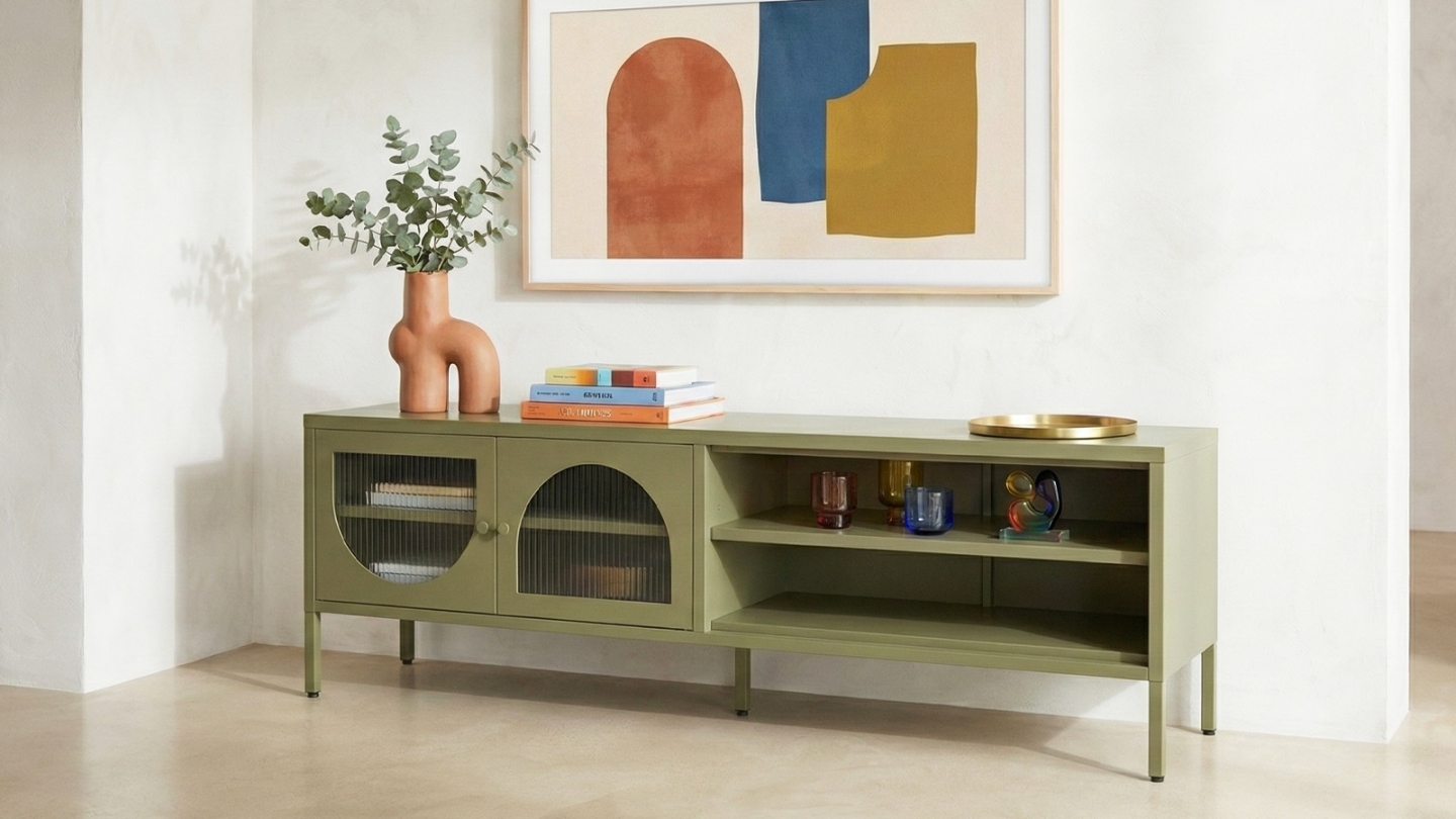 En stockBuffet - Ysia • Matière : Métal • Couleur : Vert • Portes ajourées avec empiècements géométriques en verre texturé pour une touche architecturale art déco revisitée • Piètement et poignées en métal vert • Rangements : 4 portes battantes, 1 tablette • Dimensions totales : 160 x 40 x 90 cm • Poids net : 32.5 kg