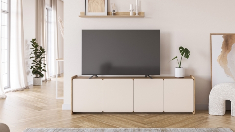 Le meuble TV Sami séduit par son design épuré et son association harmonieuse de teintes claires, parfait pour un intérieur lumineux et moderne. Conçu entièrement en mélamine, il combine une finition beige douce à un décor chêne naturel, apportant une atmosphère chaleureuse et conviviale à votre salon. Son piètement assorti complète le meuble avec finesse et stabilité.