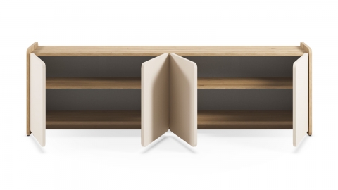 Le buffet Sami se distingue par sa capacité à offrir un équilibre entre rangements fermés et design moderne, permettant de structurer l’espace tout en apportant une touche décorative.