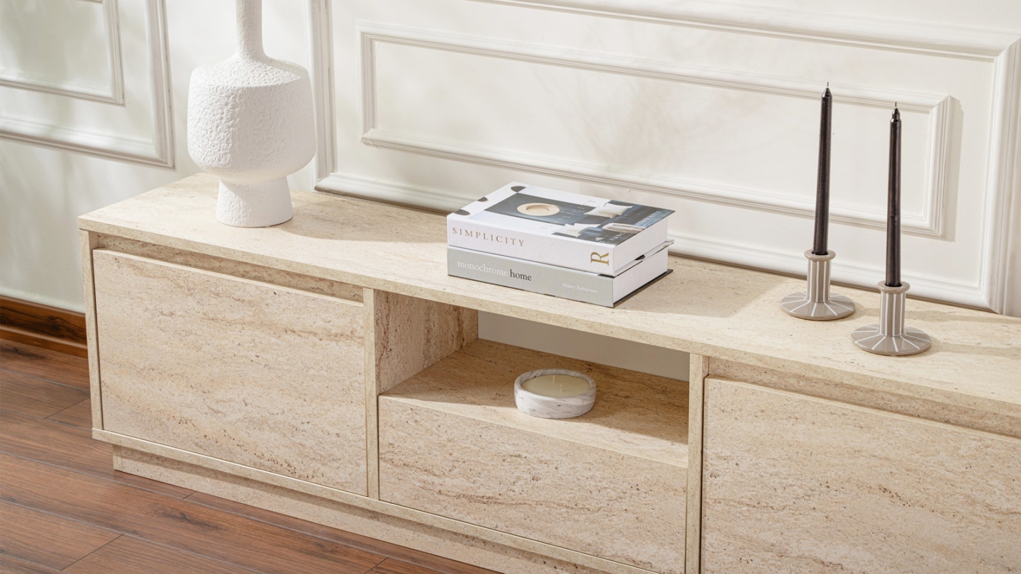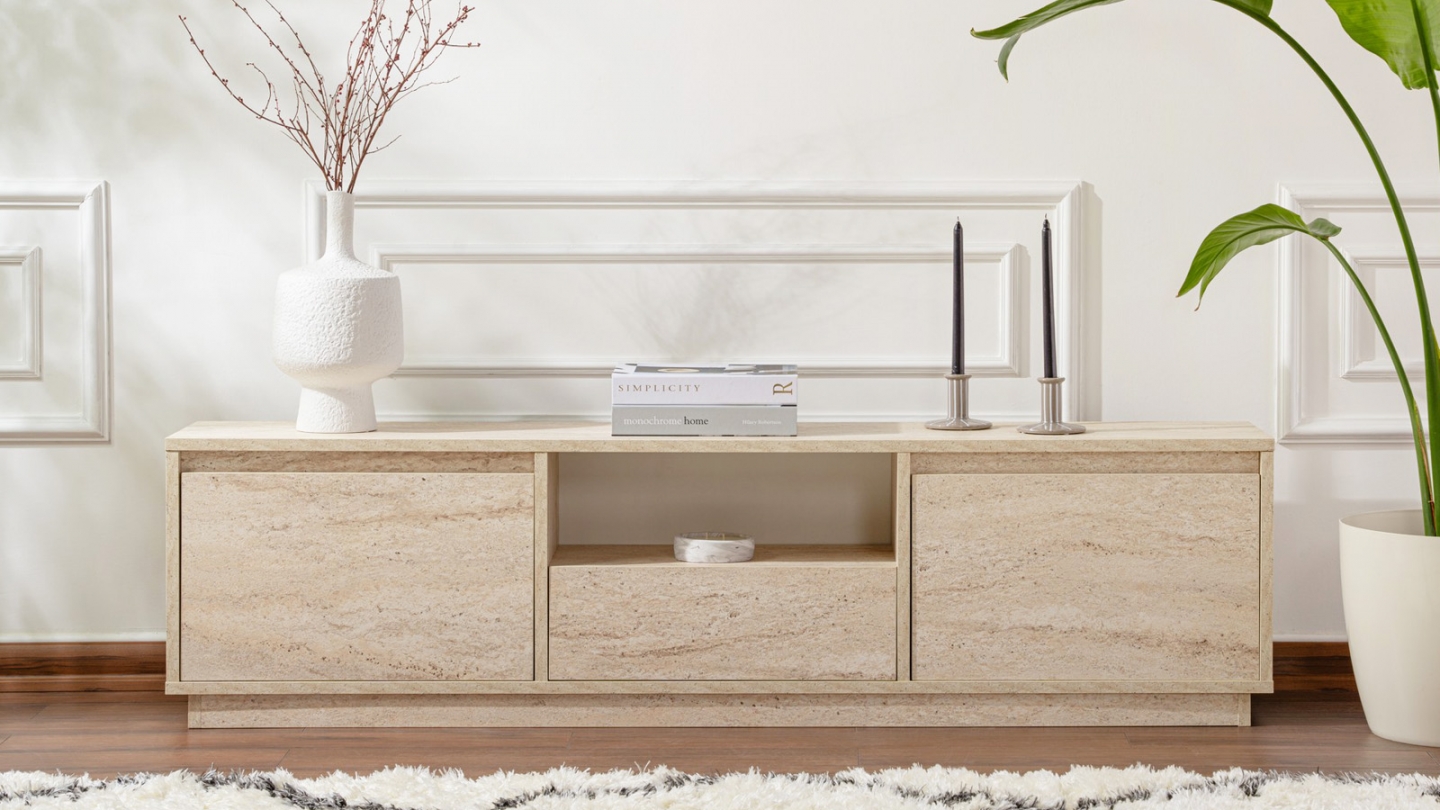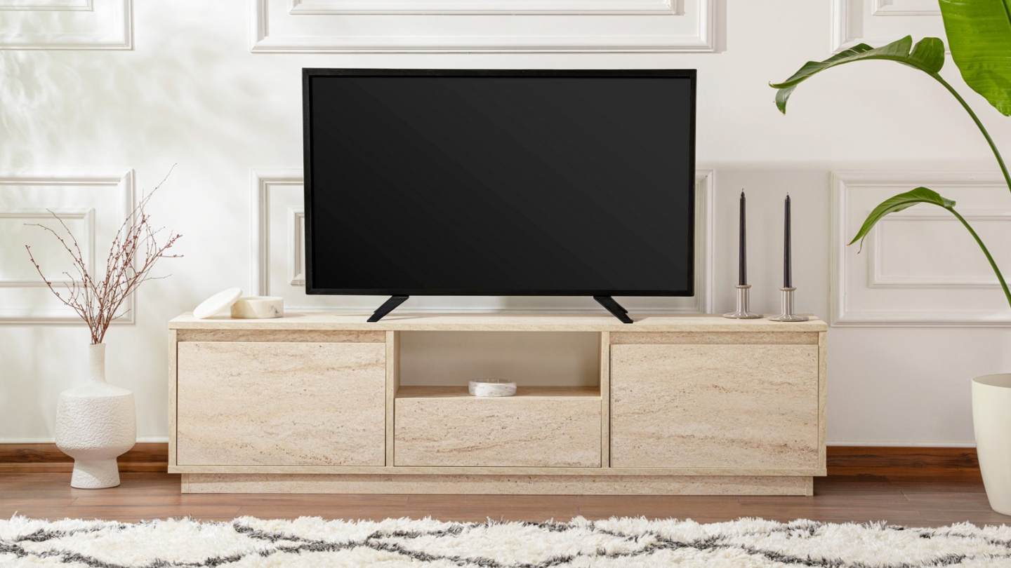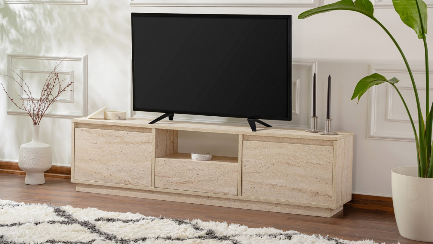 Meuble TV - Noane• Matière : Mélamine• Couleur : Blanc• Rangements : 1 niche, 3 portes• Dimensions totales : 160 x 29.5 x 42 cm