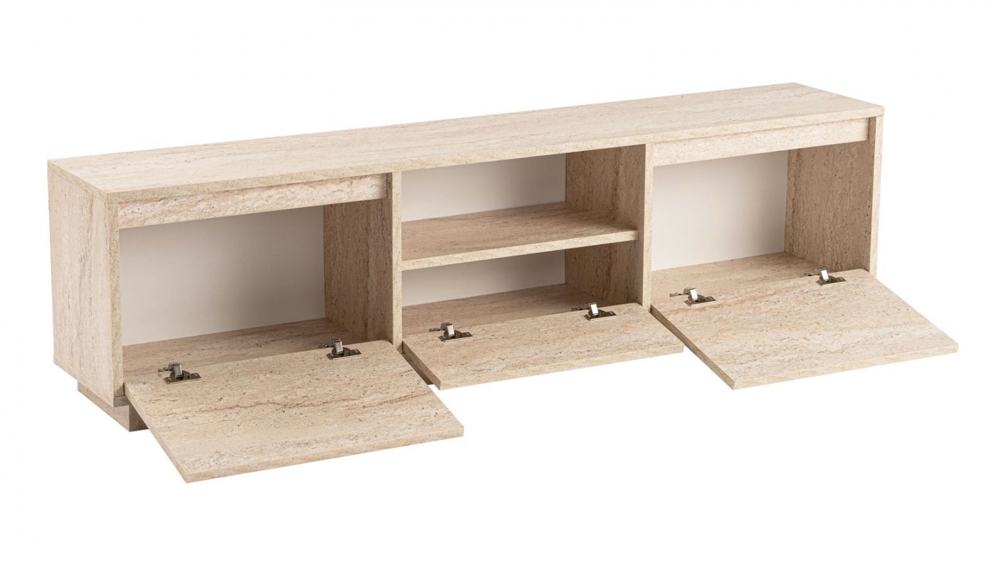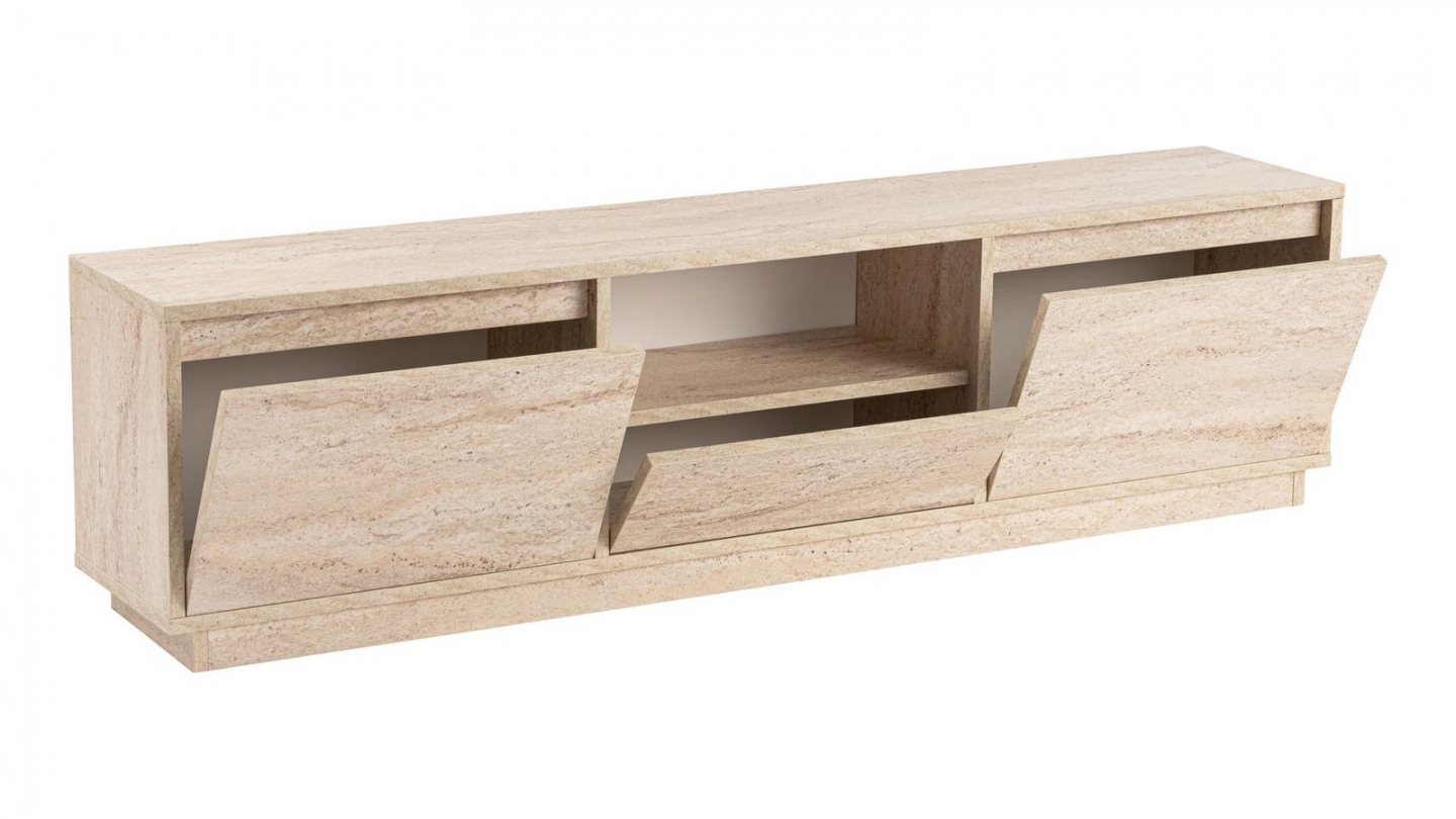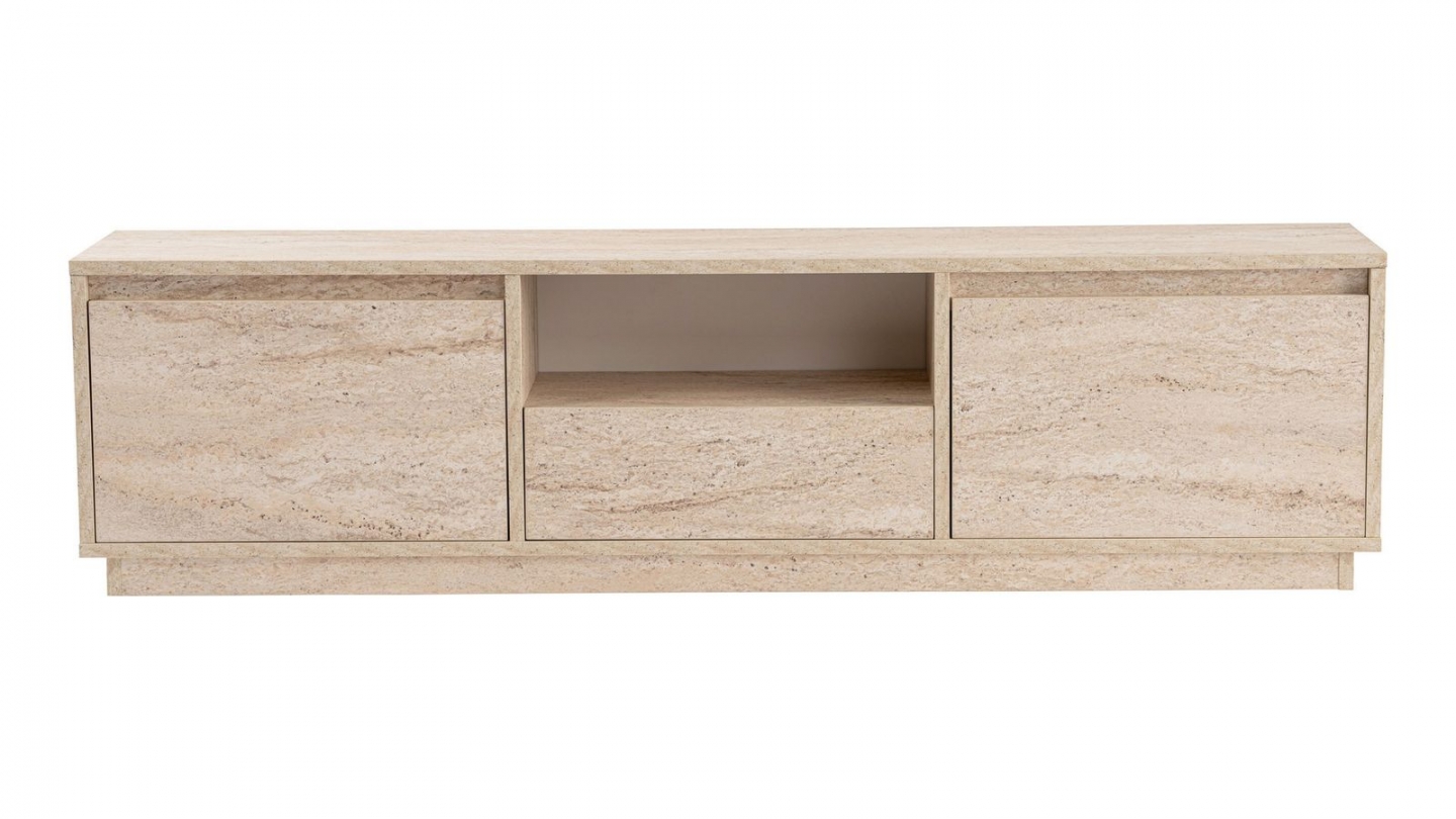 Meuble TV - Noane• Matière : Mélamine• Couleur : Effet bois• Rangements : 1 niche, 3 portes• Dimensions totales : 160 x 29.5 x 42 cm