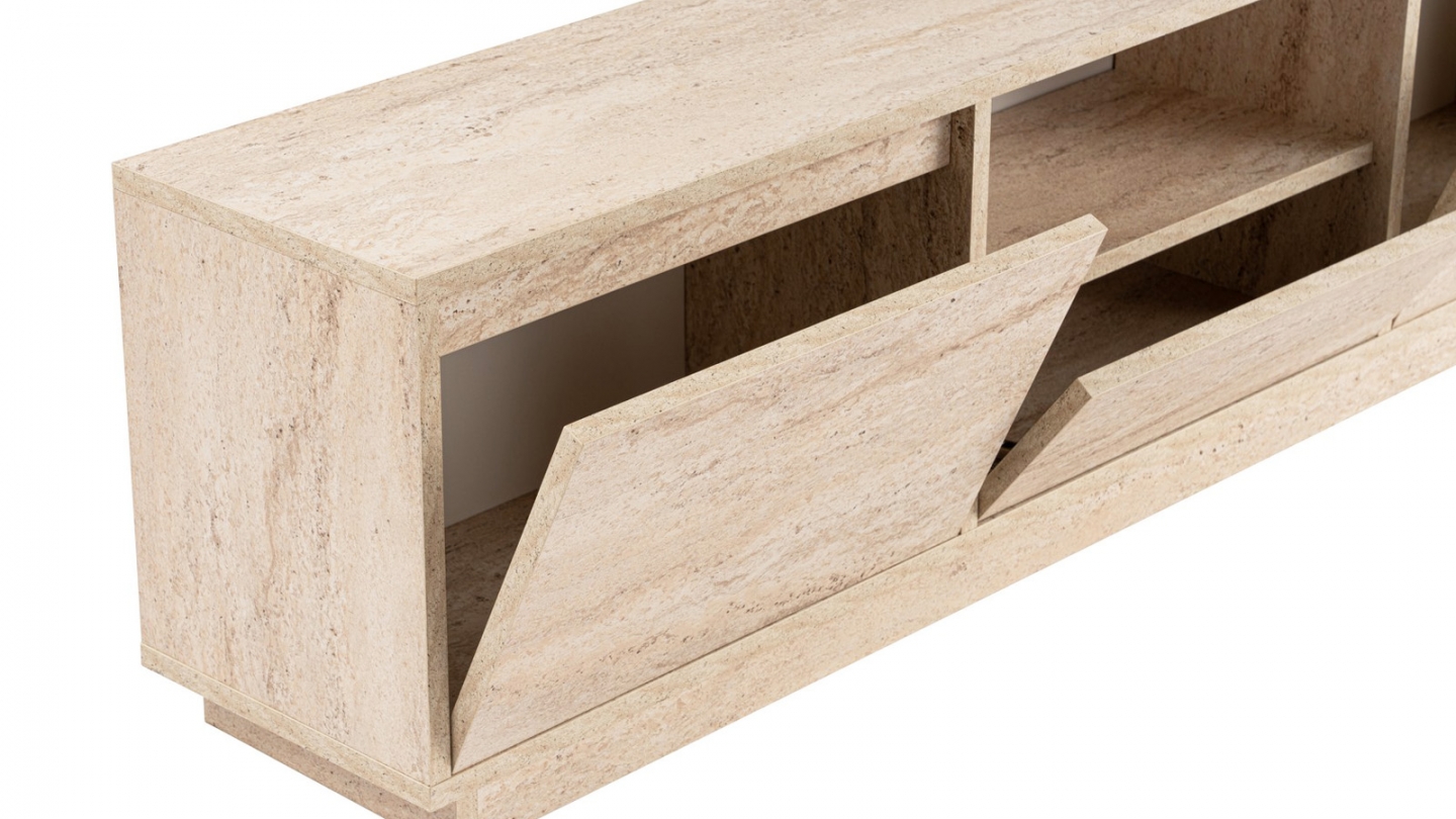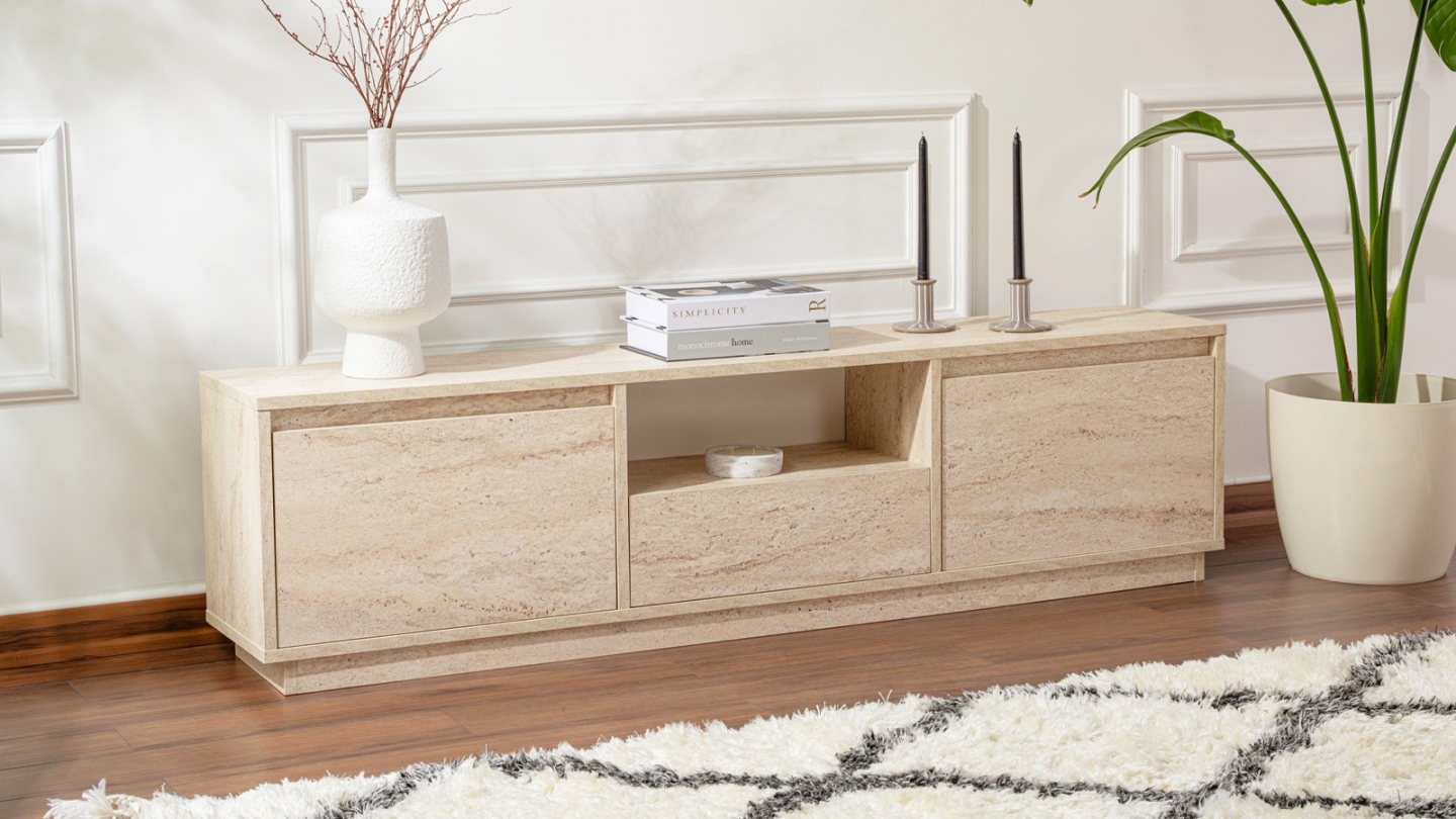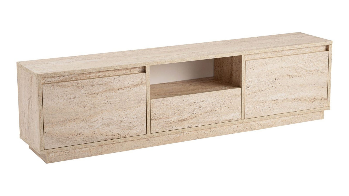 Meuble TV - Noane• Matière : Mélamine• Couleur : Effet bois• Rangements : 1 niche, 3 portes• Dimensions totales : 160 x 29.5 x 42 cm