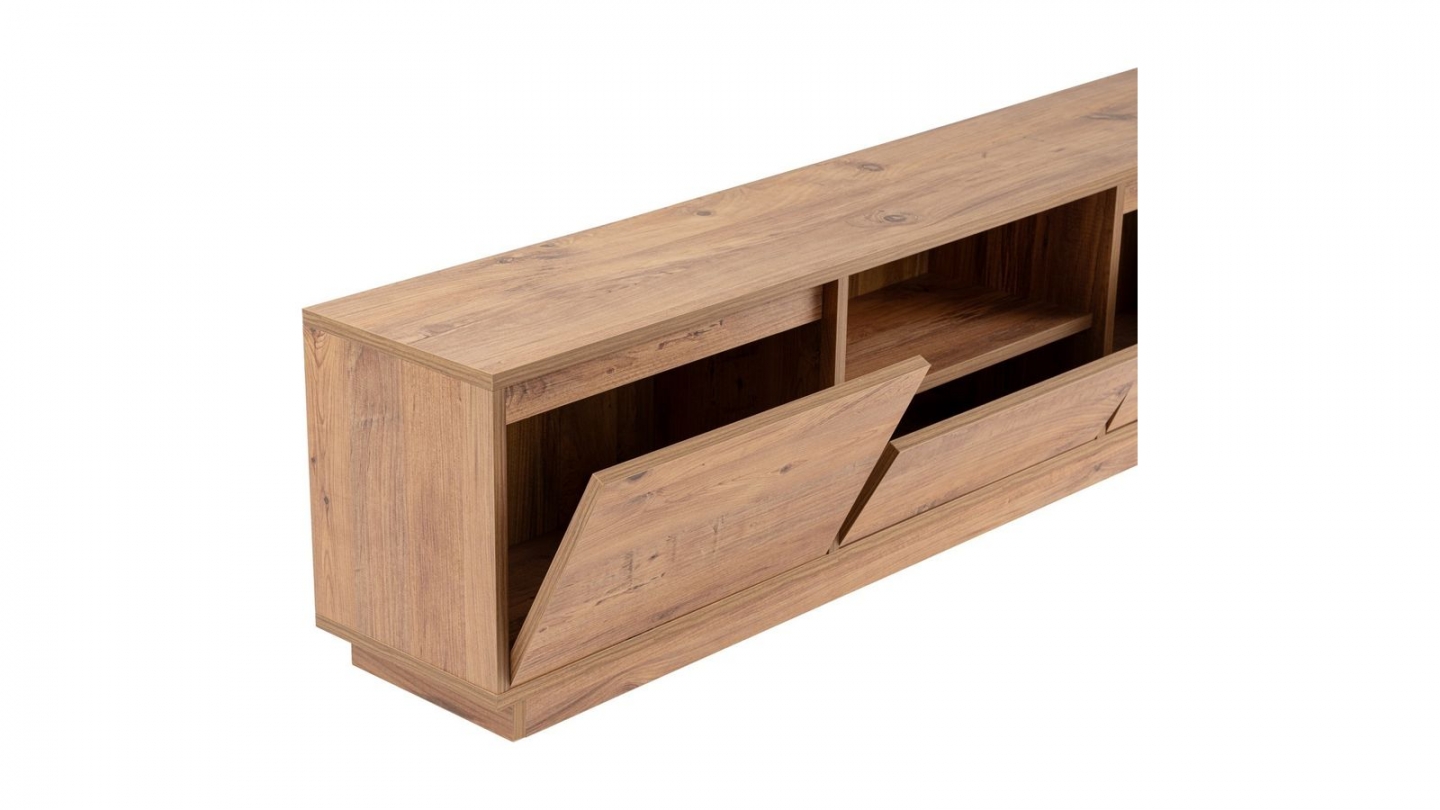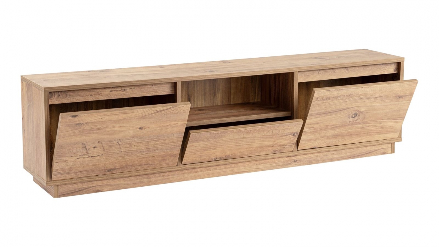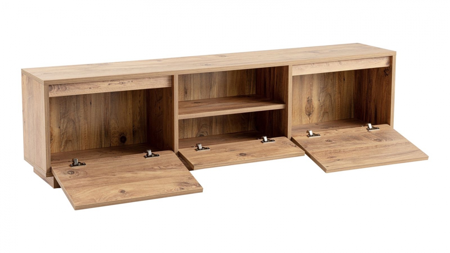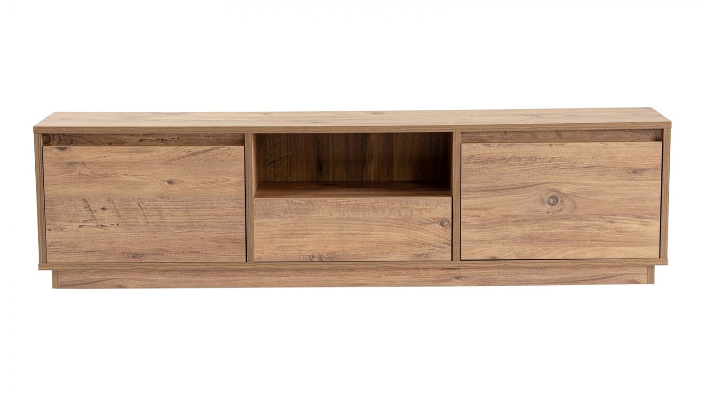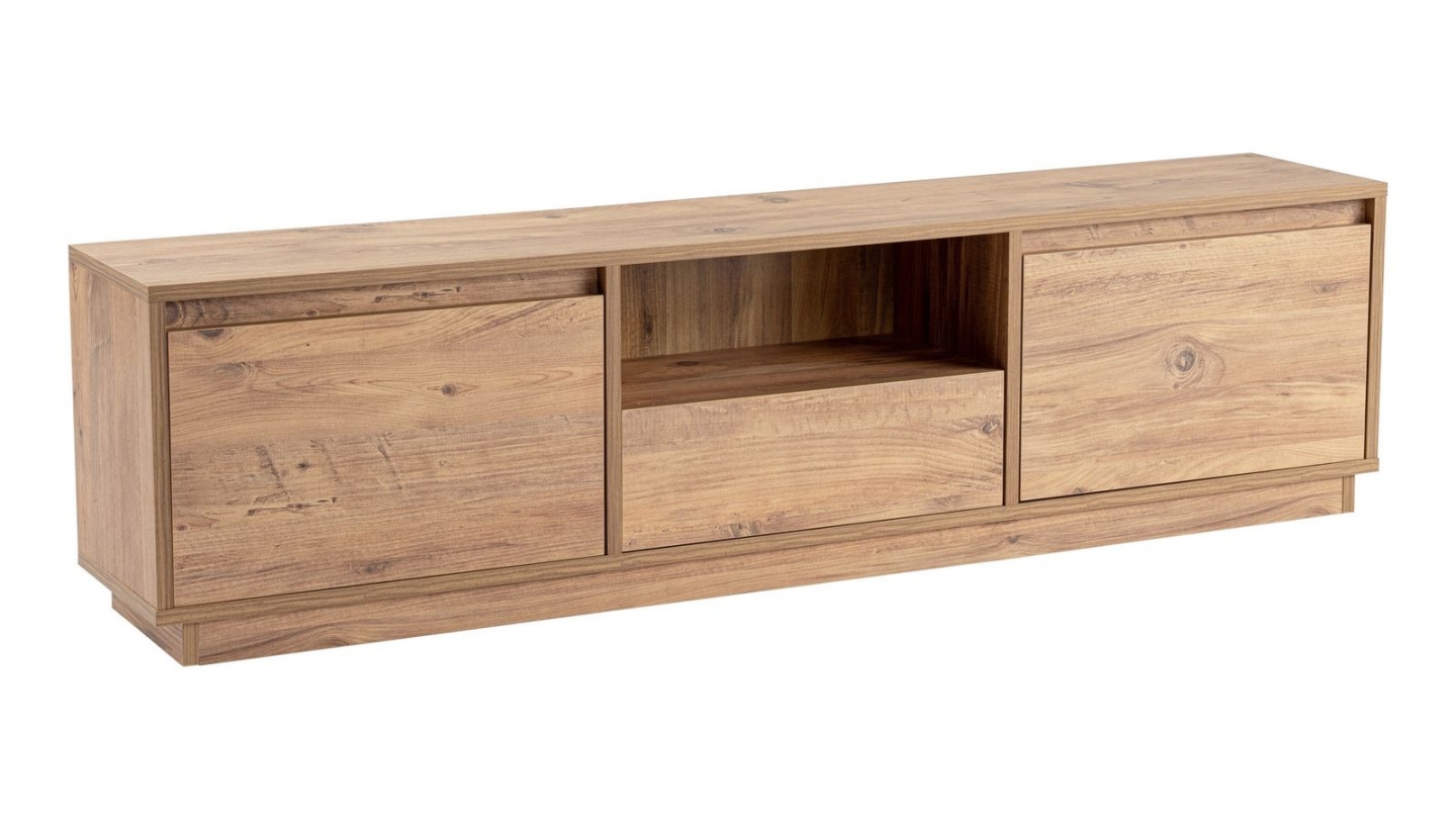 Meuble TV - Noane• Matière : Mélamine• Couleur : Effet travertin• Rangements : 1 niche, 3 portes• Dimensions totales : 160 x 29.5 x 42 cm