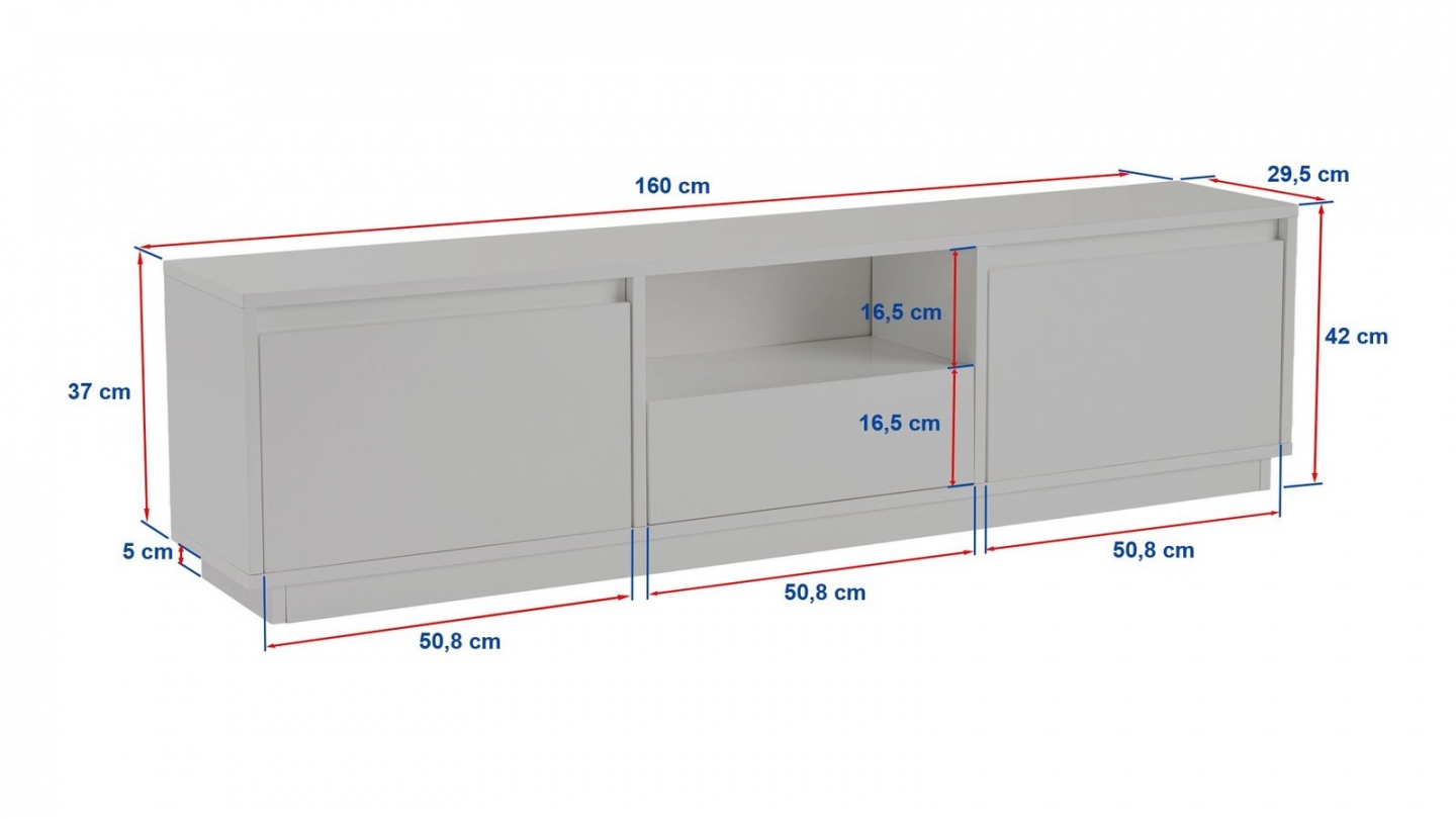 Meuble TV - Noane• Matière : Mélamine• Couleur : Blanc• Rangements : 1 niche, 3 portes• Dimensions totales : 160 x 29.5 x 42 cm