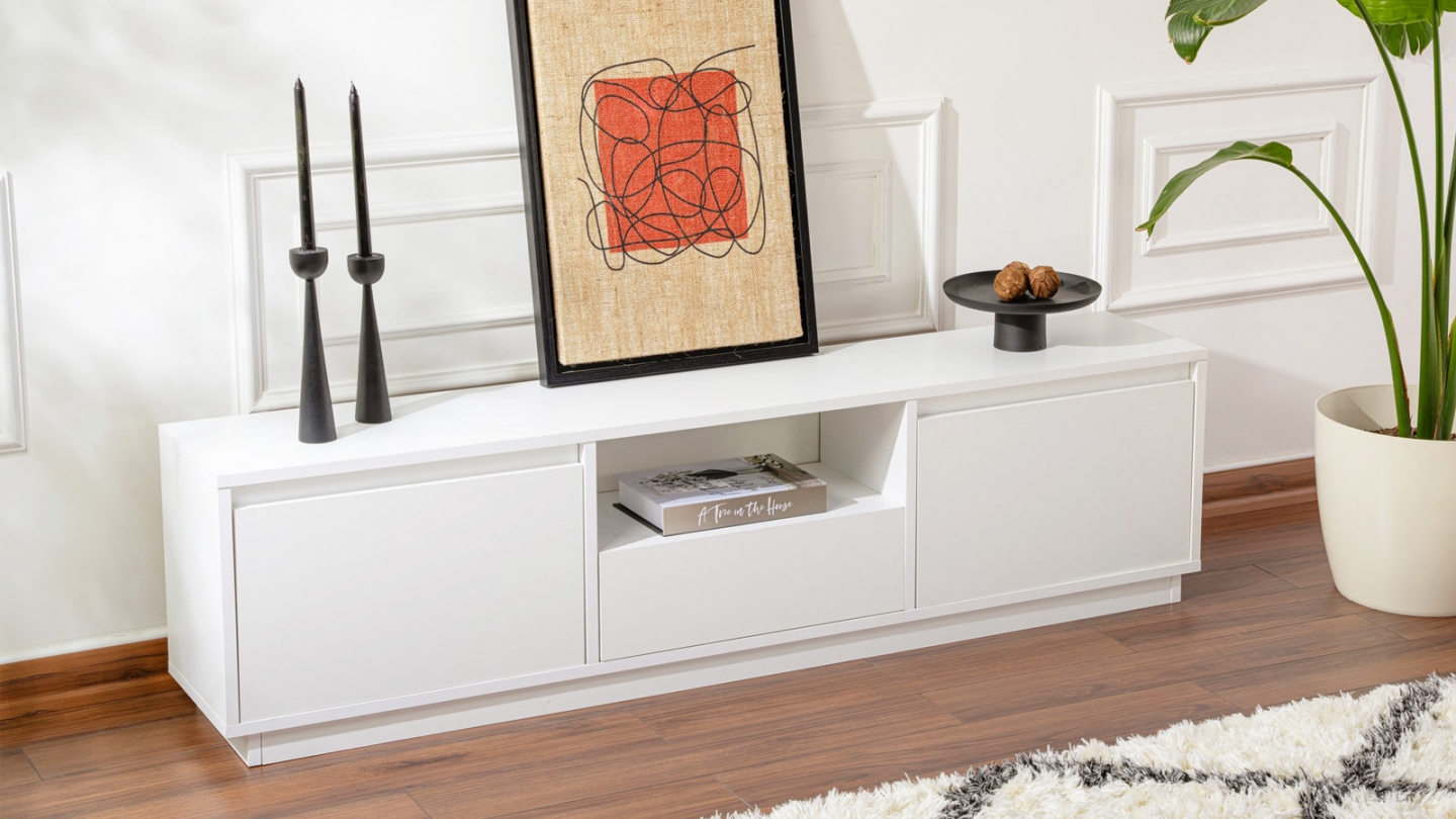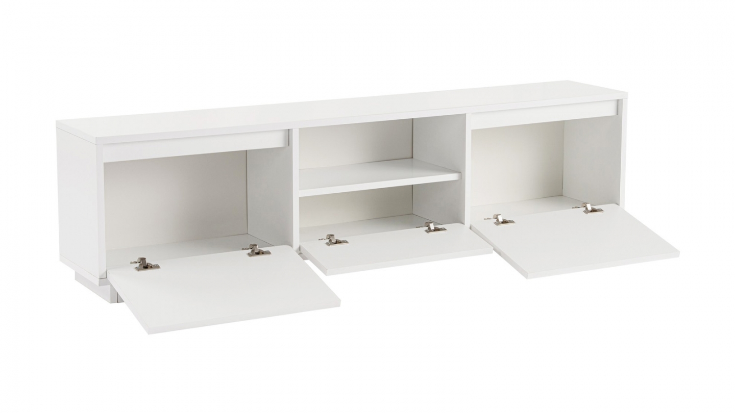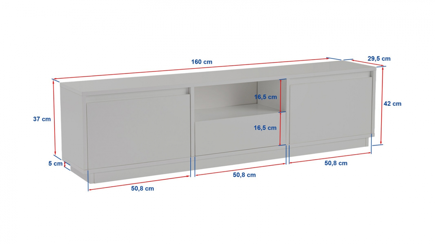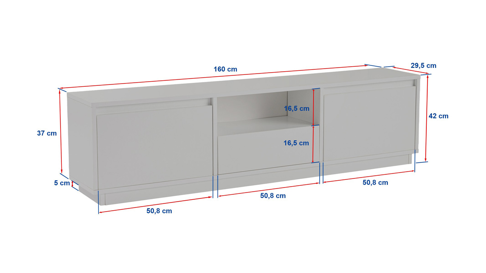 Meuble TV - Noane• Matière : Mélamine• Couleur : Effet bois• Rangements : 1 niche, 3 portes• Dimensions totales : 160 x 29.5 x 42 cm
