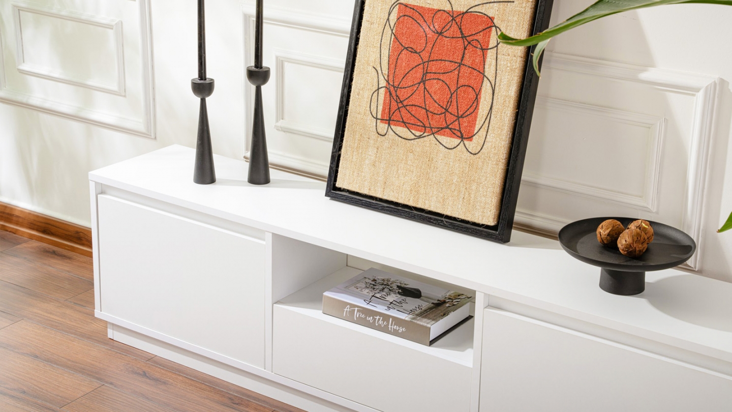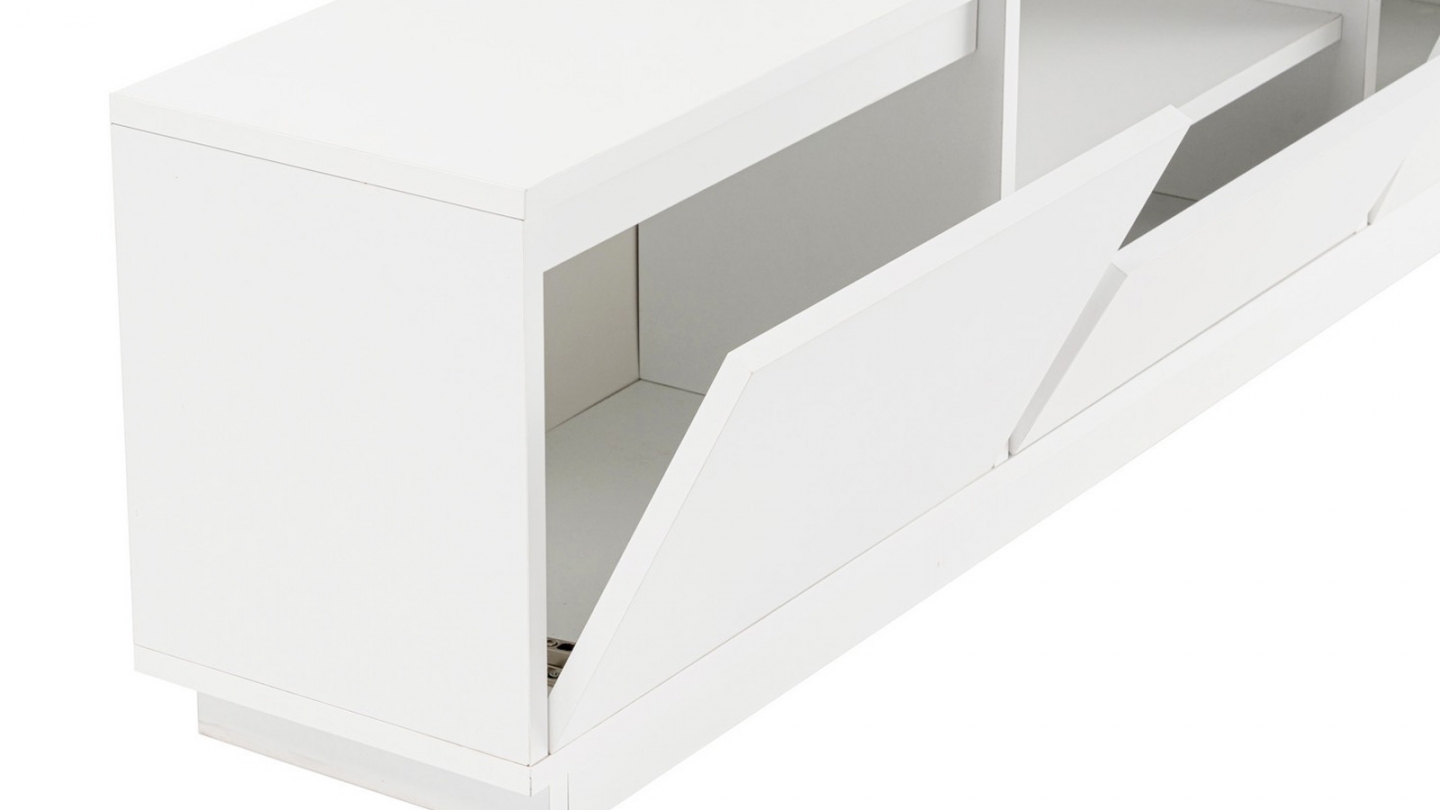 Meuble TV - Noane• Matière : Mélamine• Couleur : Effet travertin• Rangements : 1 niche, 3 portes• Dimensions totales : 160 x 29.5 x 42 cm