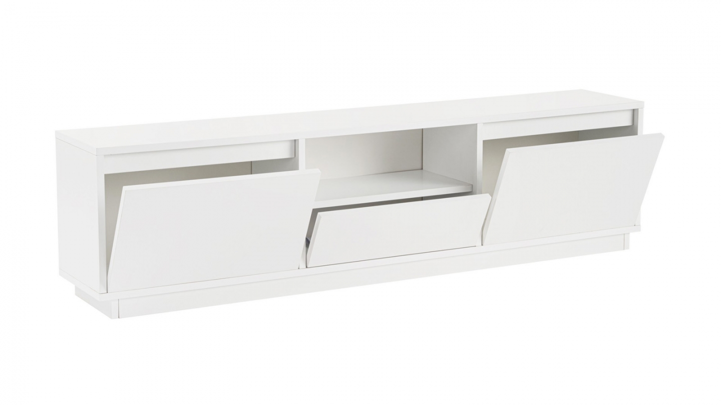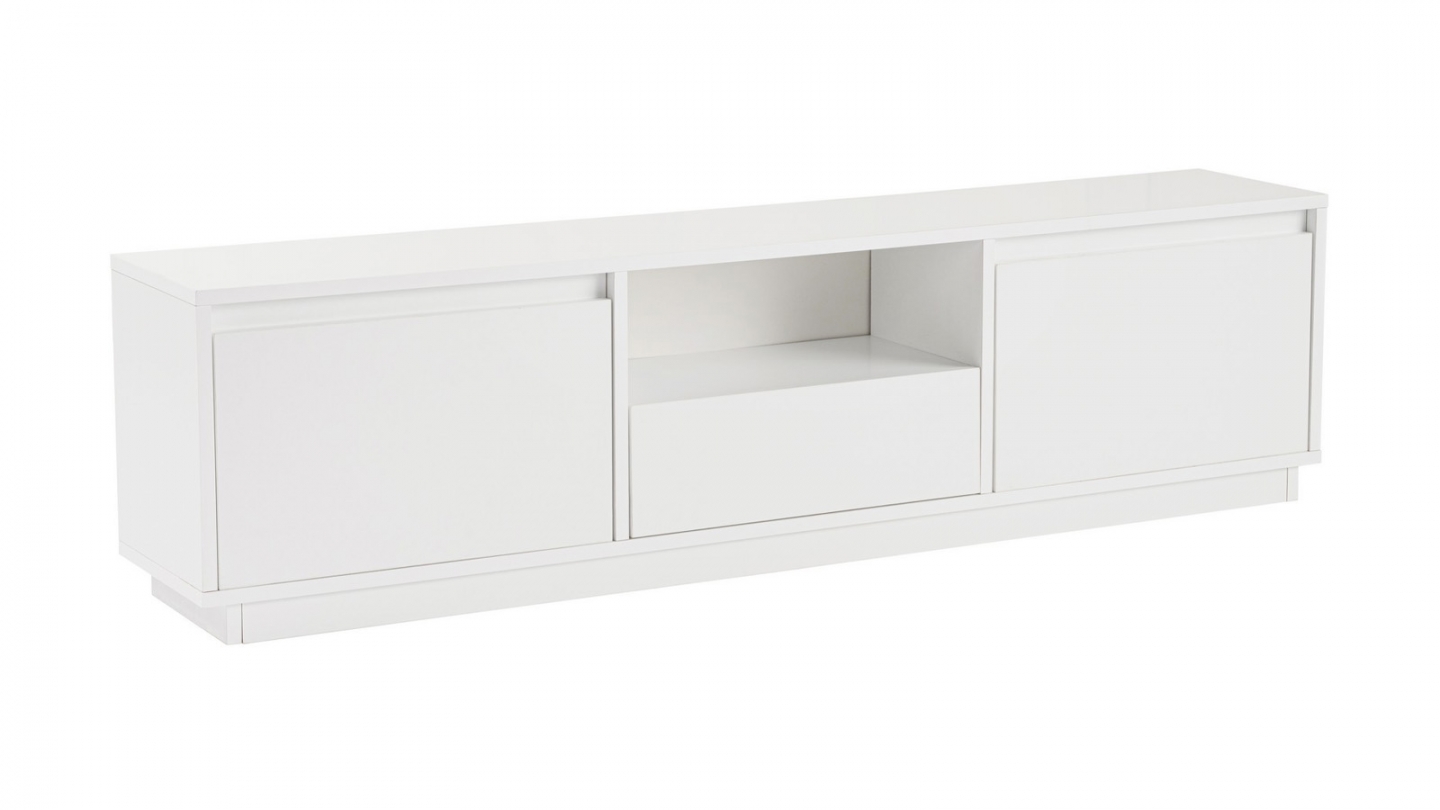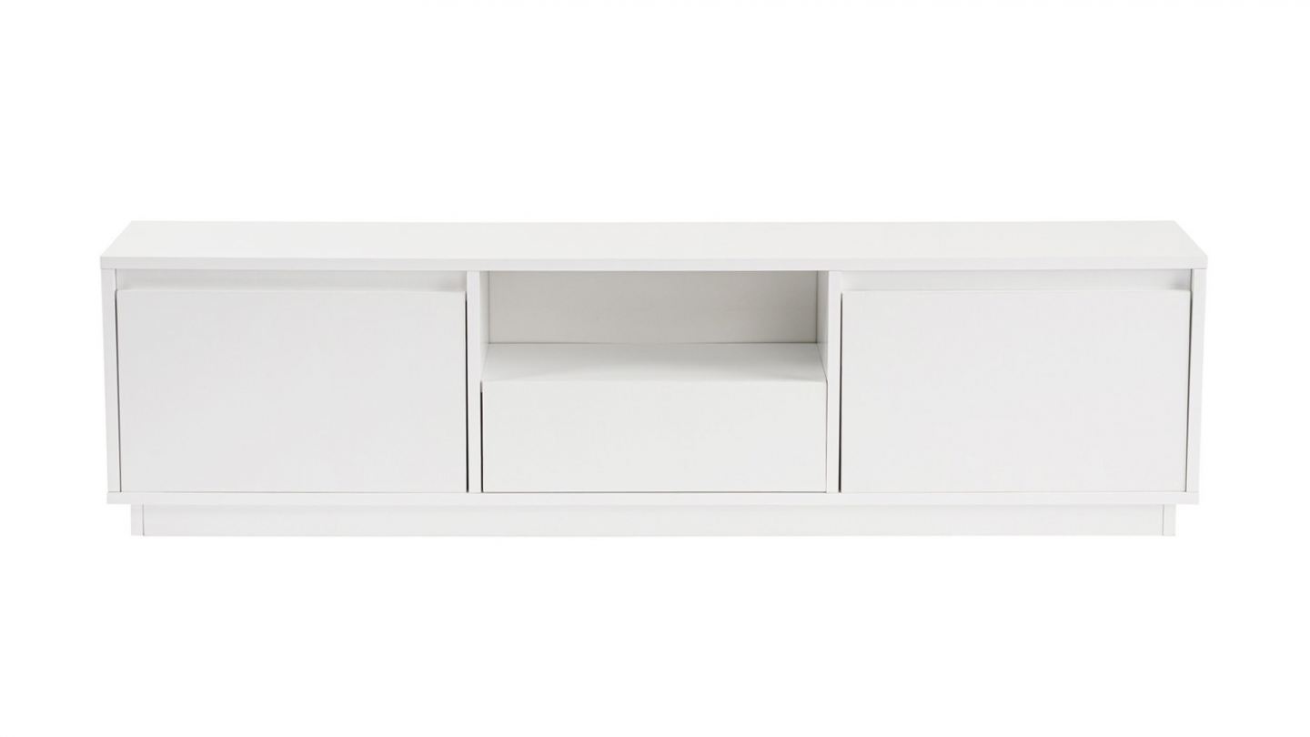En stockMeuble TV - Ida • Matière de la structure : Pin massif • Finition : Corps de meuble en bois peint. Plateau supérieur couleur bois. • Couleur : Blanc • Finition des tiroirs : Blanc • Finition des portes : Blanc • Piètement en Pin massif couleur blanc - hauteur 8 cm • Poignées : Métal noir • Rangements : 2 niches, 1 porte battante, 1 tablette, 2 tiroirs •...
