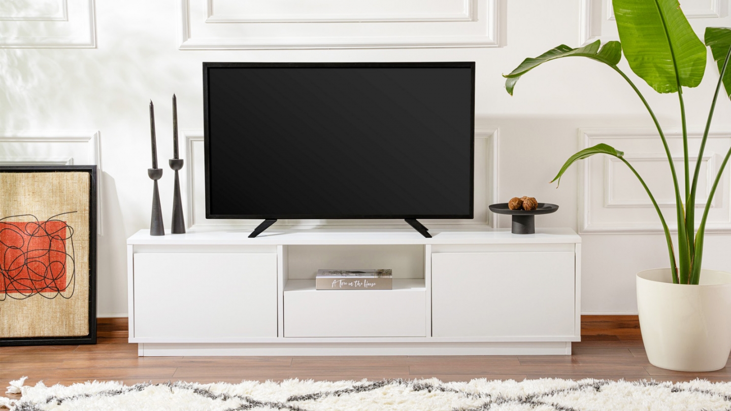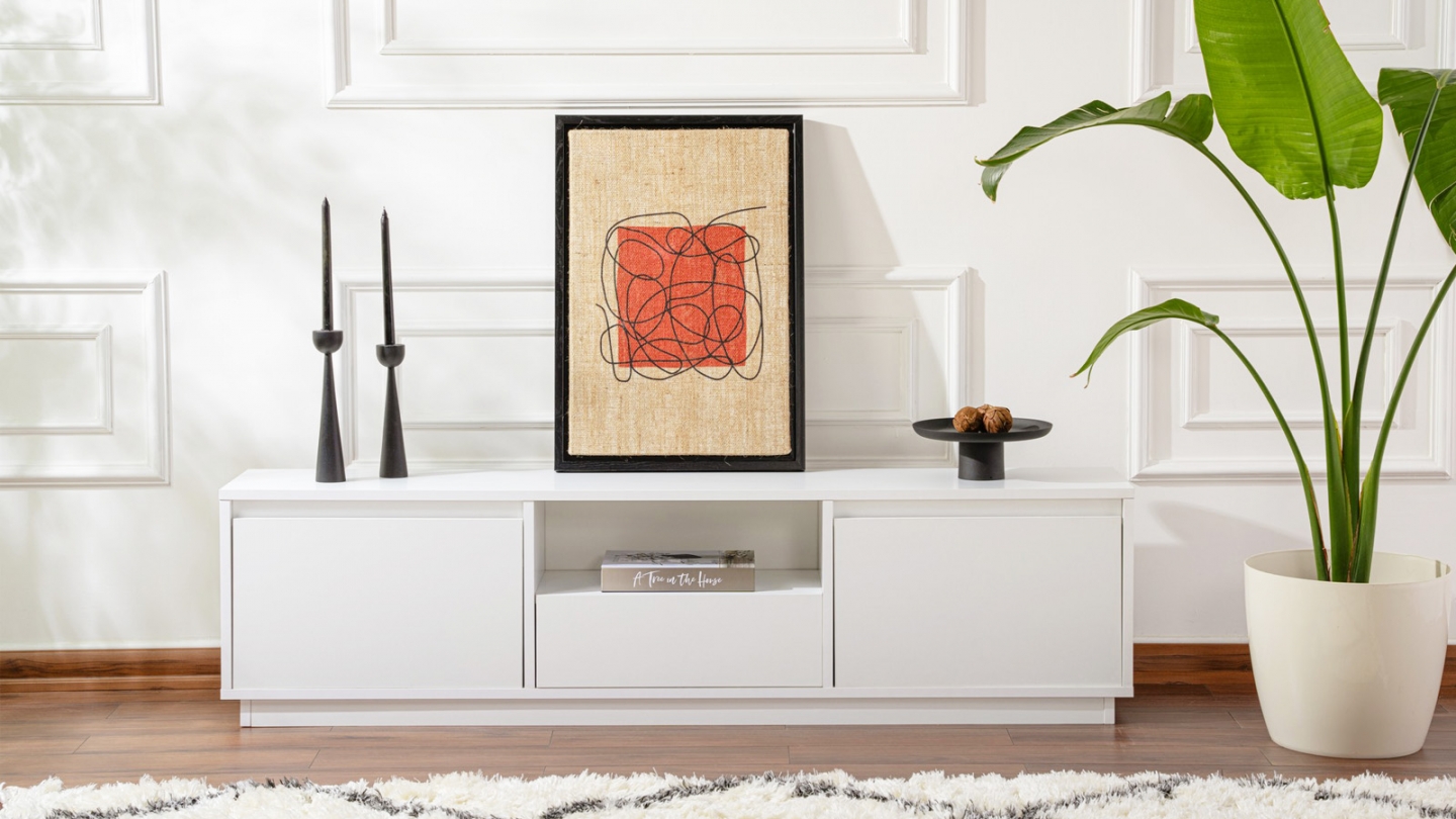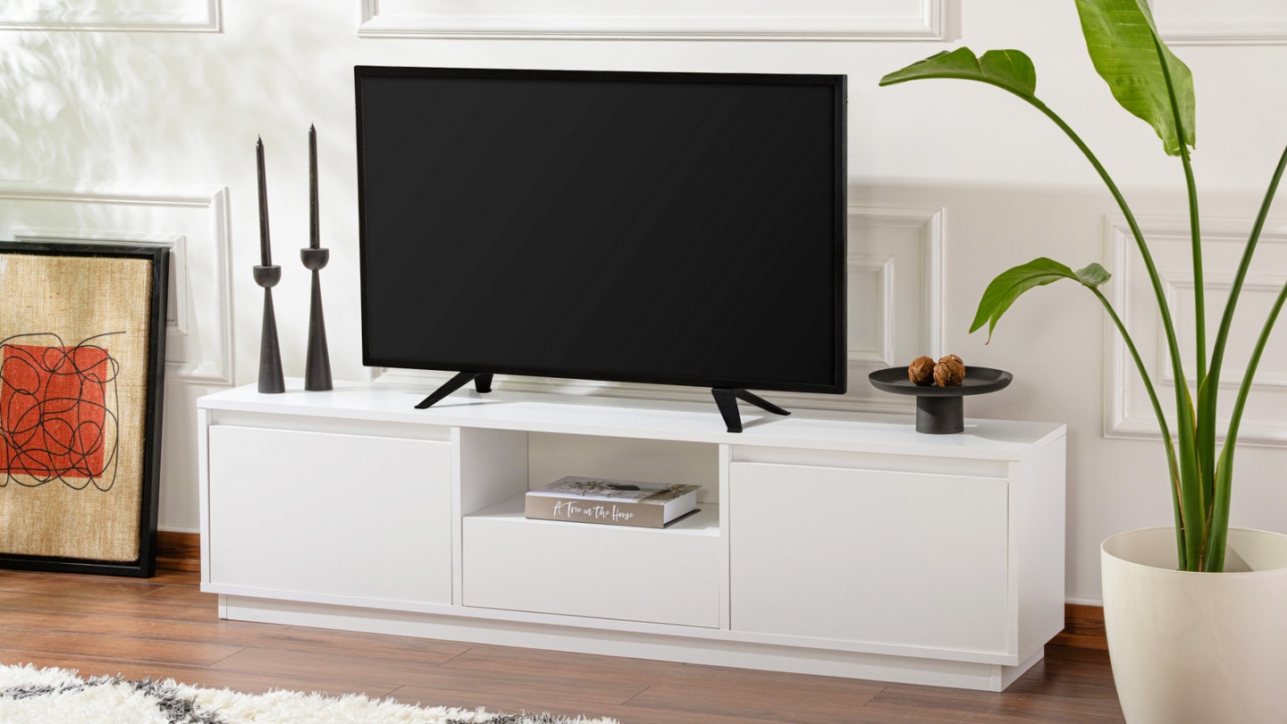 En stockMeuble TV - Ida • Matière de la structure : Pin massif • Finition : Corps de meuble en bois peint. Plateau supérieur couleur bois. • Couleur : Blanc • Finition des tiroirs : Blanc • Finition des portes : Blanc • Piètement en Pin massif couleur blanc - hauteur 8 cm • Poignées : Métal noir • Rangements : 2 niches, 1 porte battante, 1 tablette, 2 tiroirs •...
