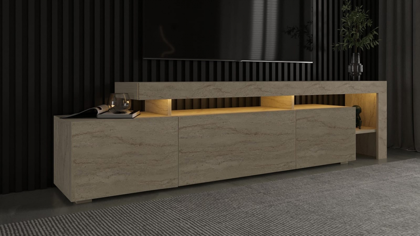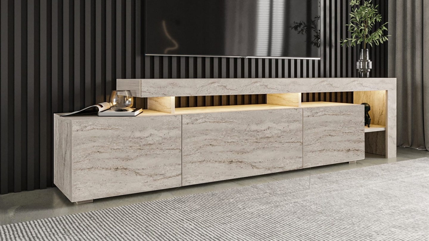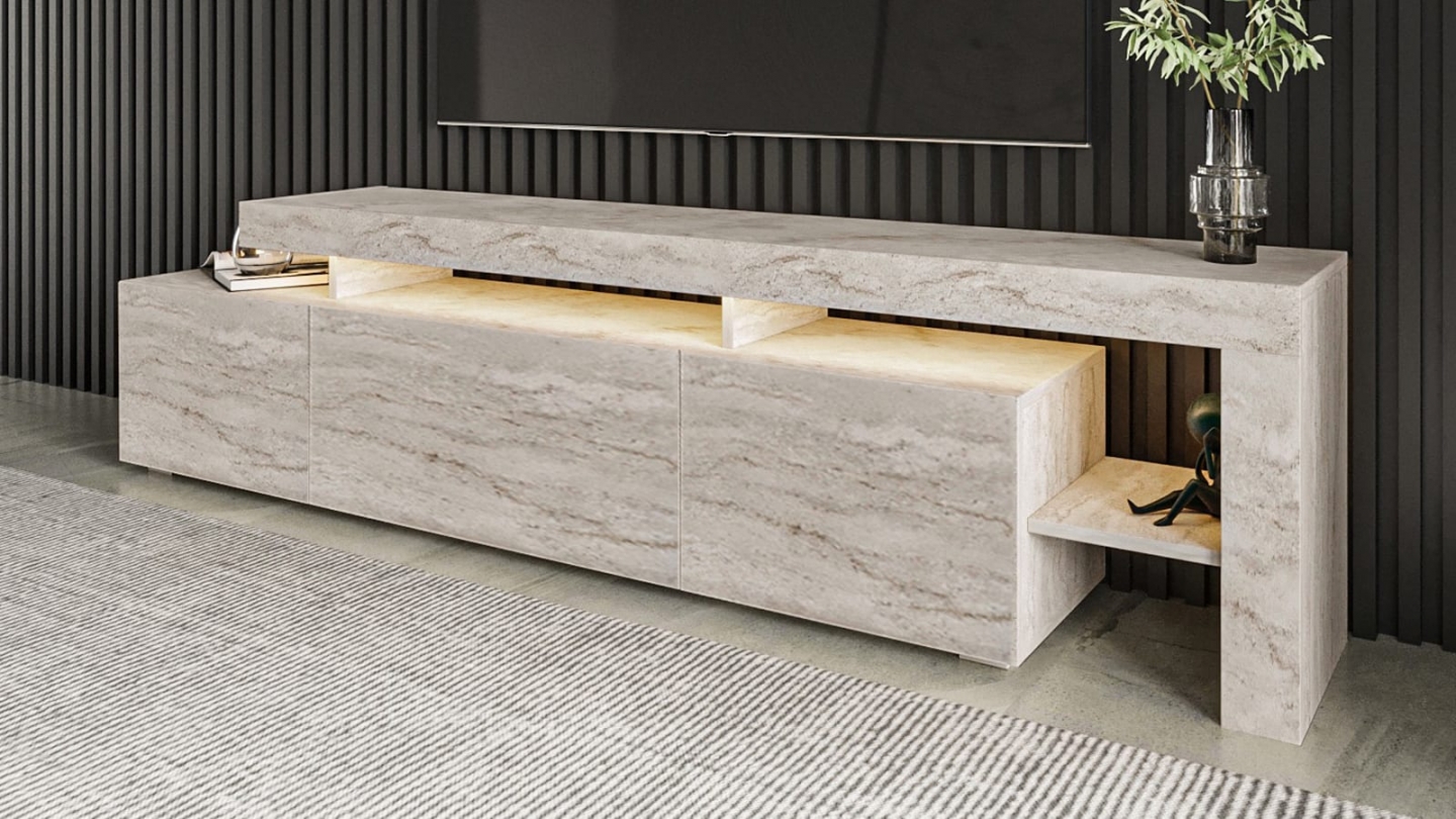 • Meuble TV design effet travertin, sublimé par un éclairage LED intégré qui met en valeur ses lignes épurées et ses finitions minérales. Ses nombreux rangements fermés et niches ouvertes offrent à la fois fonctionnalité et élégance, parfait pour un salon contemporain et sophistiqué.
