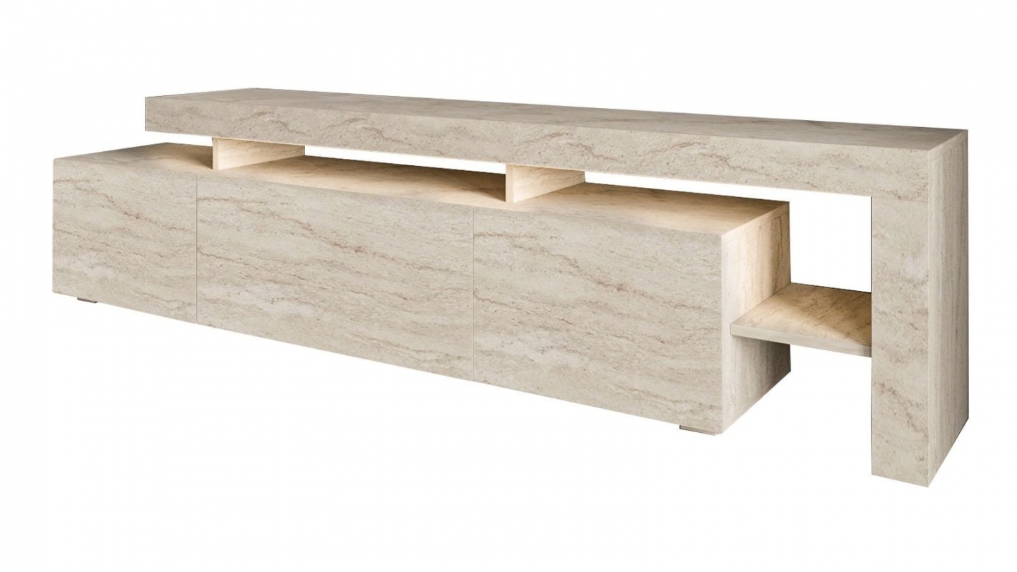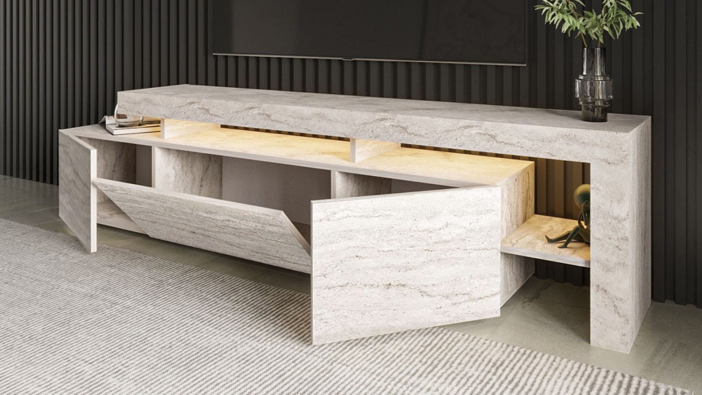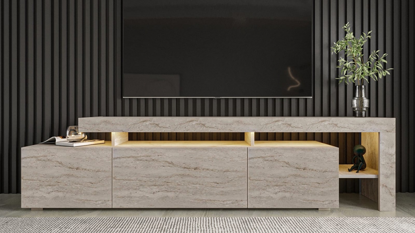 • Meuble TV design effet travertin, sublimé par un éclairage LED intégré qui met en valeur ses lignes épurées et ses finitions minérales. Ses nombreux rangements fermés et niches ouvertes offrent à la fois fonctionnalité et élégance, parfait pour un salon contemporain et sophistiqué.