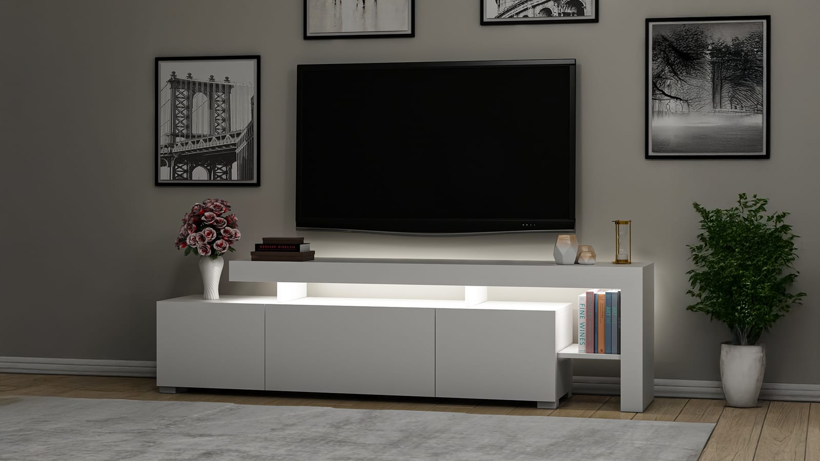 • Meuble TV design blanc avec éclairage LED intégré, alliant modernité et élégance. Ses façades épurées et ses niches lumineuses apportent une touche raffinée à l’espace tout en offrant de multiples rangements pratiques pour une organisation harmonieuse du salon.