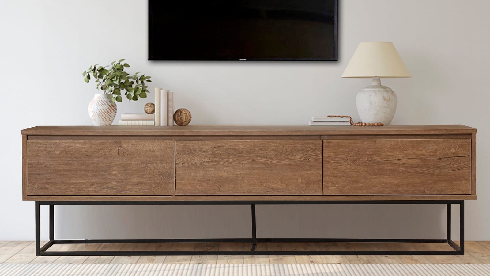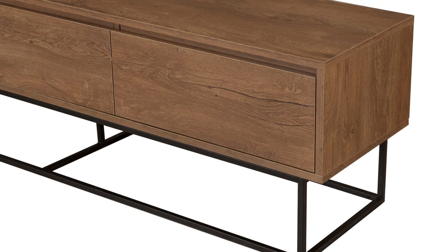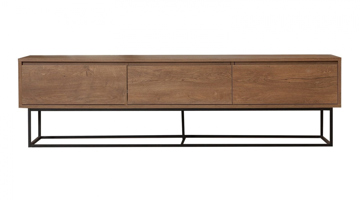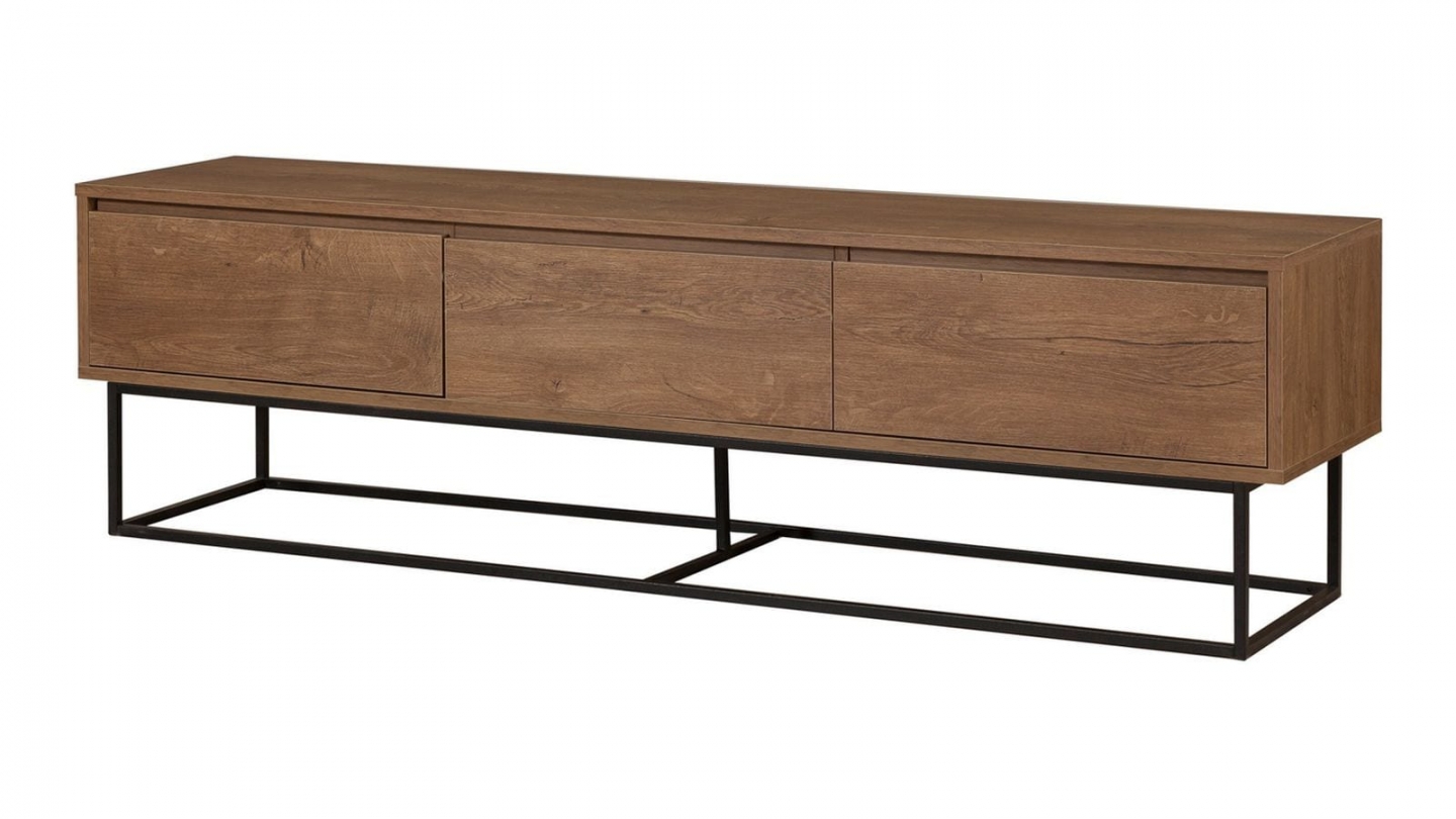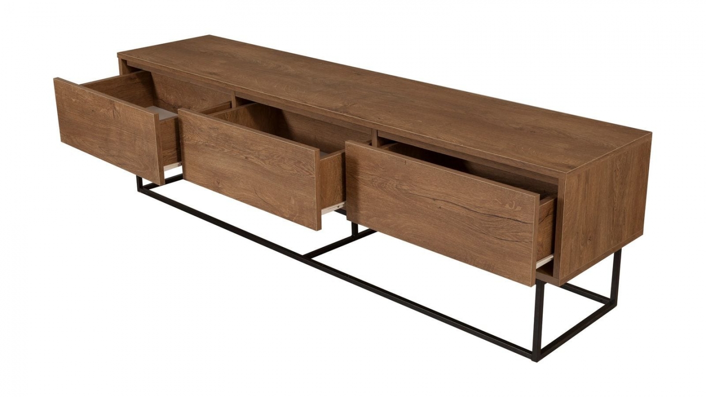 • Meuble TV en bois au design industriel, soutenu par une structure métallique noire. Il dispose de trois grands tiroirs pour vos appareils multimédia ou vos objets déco.