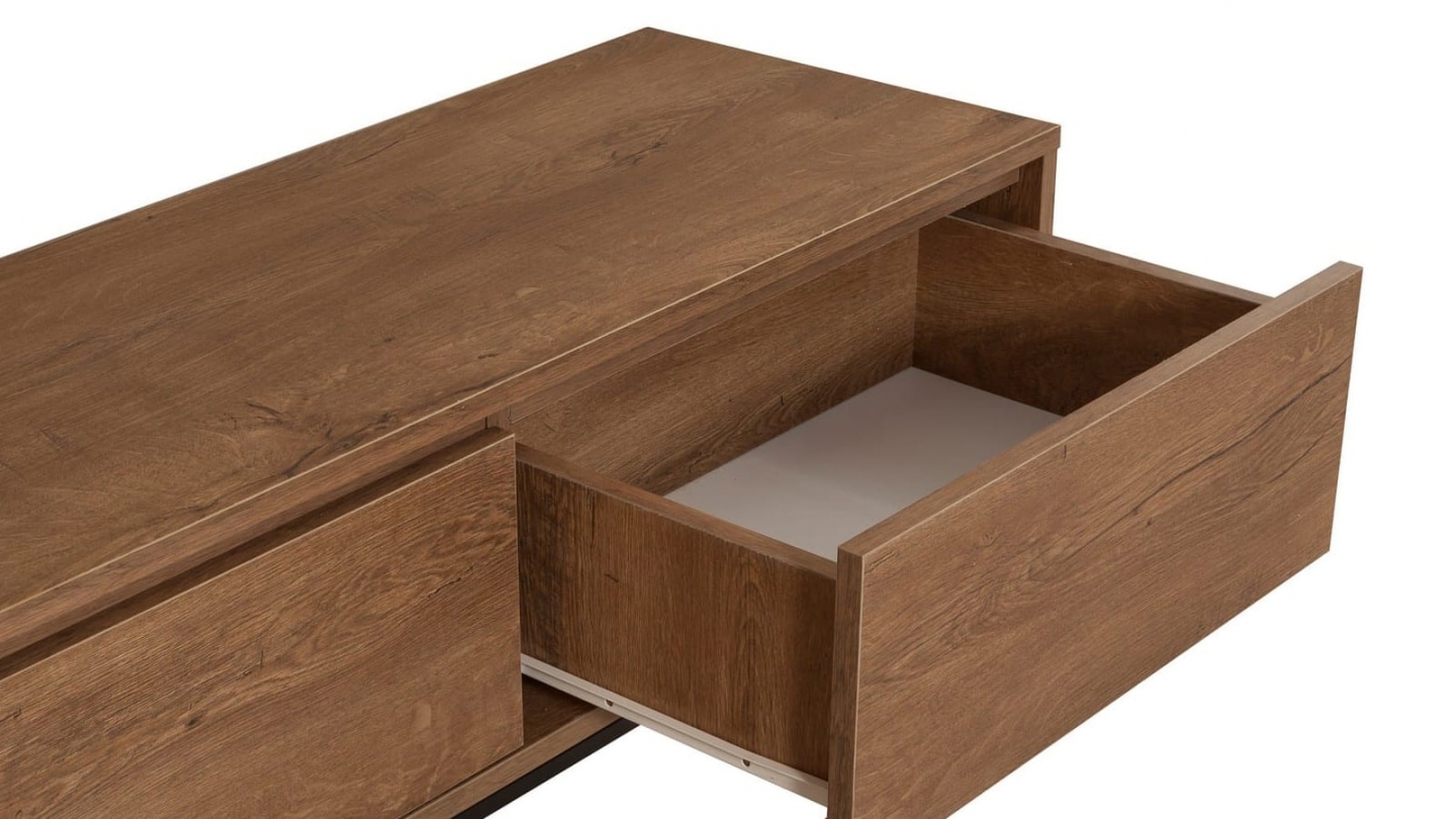 En stockMeuble TV - Nerio• Matière : Métal, Mélamine• Couleur : Meuble : effet Noyer - Piètement : noir• Meuble TV en bois au design industriel, soutenu par une structure métallique noire. Il dispose de deux grands tiroirs et de niches ouvertes parfaites pour vos appareils multimédia ou vos objets déco.• Piètement en Métal noir• Rangements : 2 niches, 2 tiroirs•...