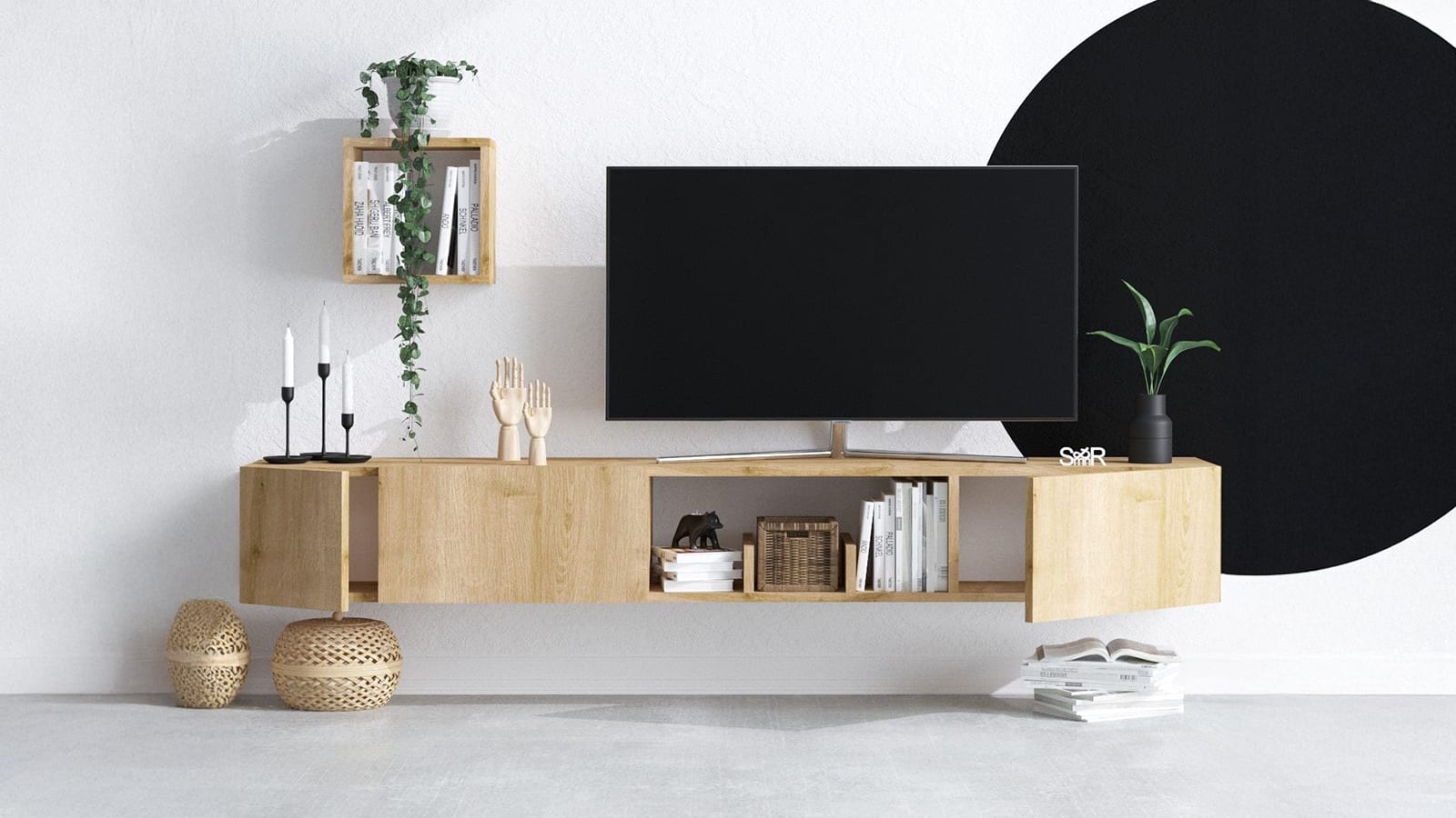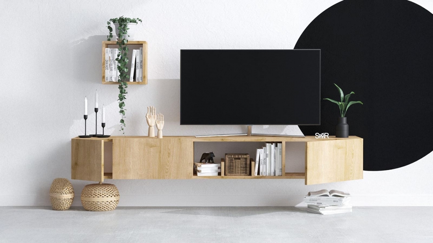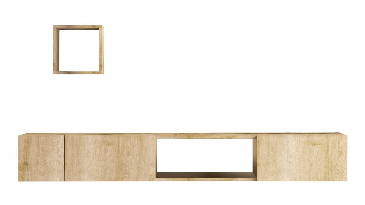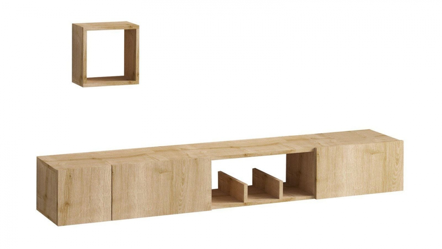 • Meuble TV mural au design épuré, avec rangements fermés et cube suspendu assorti pour une composition moderne et fonctionnelle. A fixer au mur.