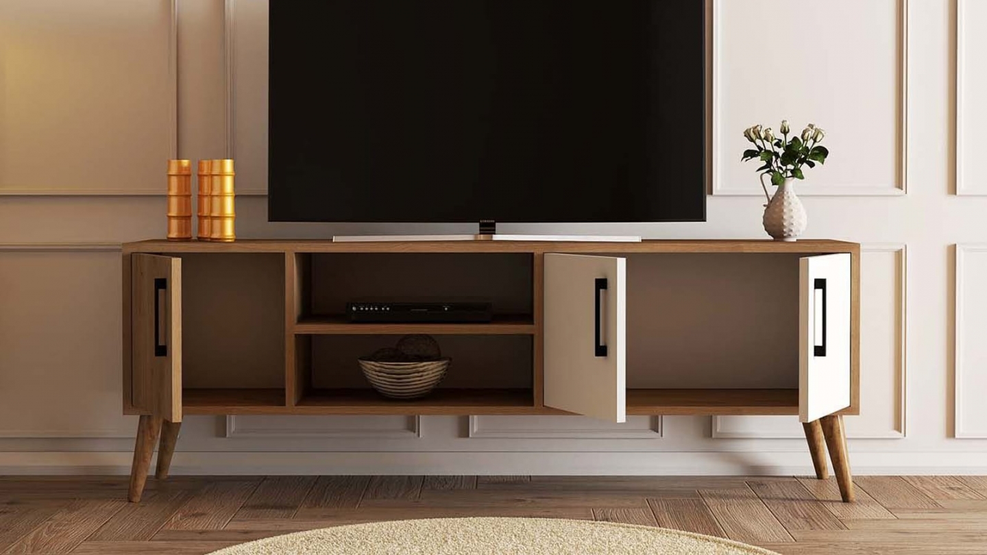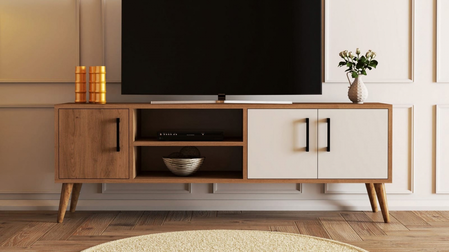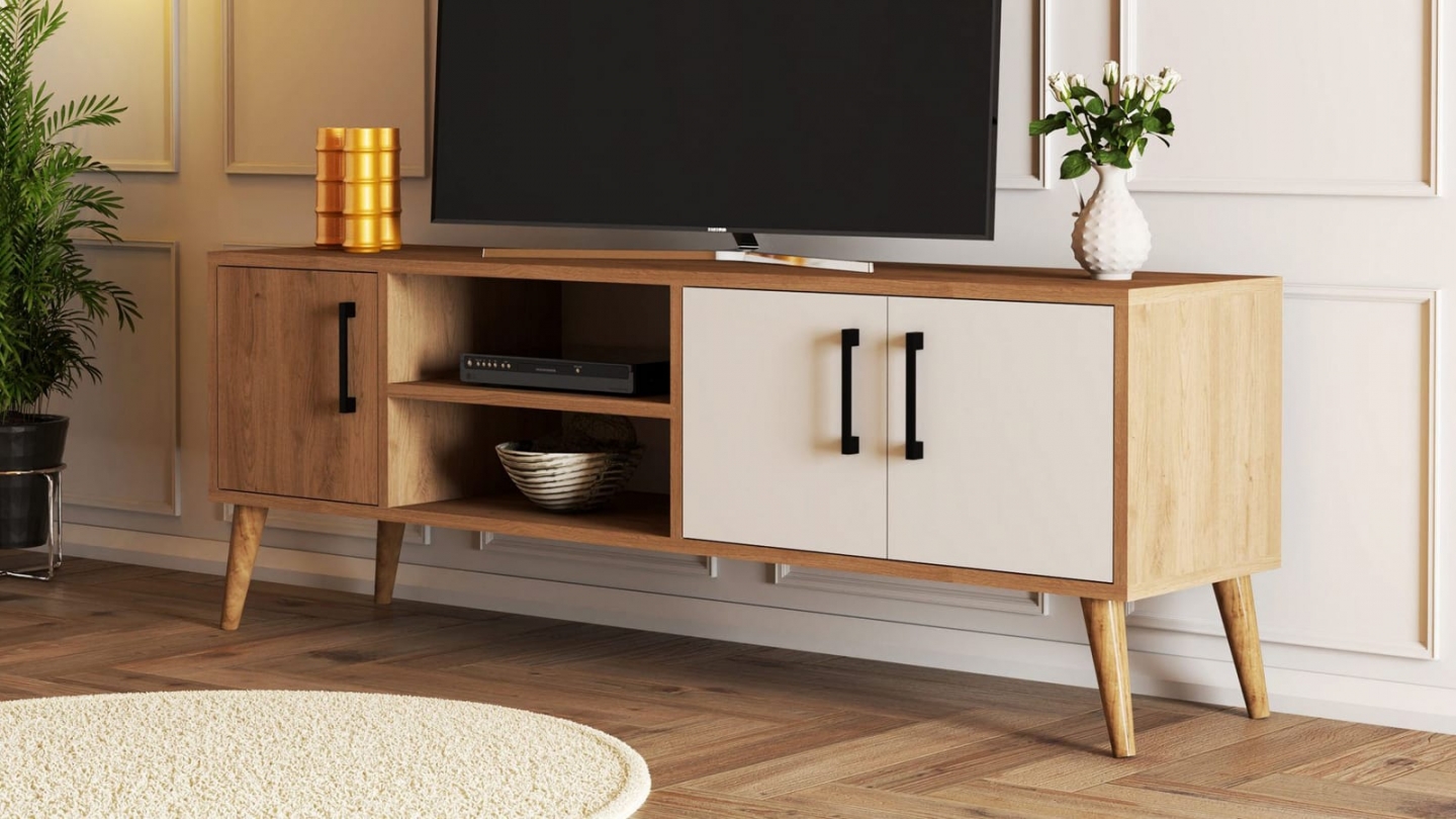 • Design scandinave, mêlant bois clair et portes blanches pour un style à la fois lumineux et chaleureux, idéal pour un salon moderne et convivial.