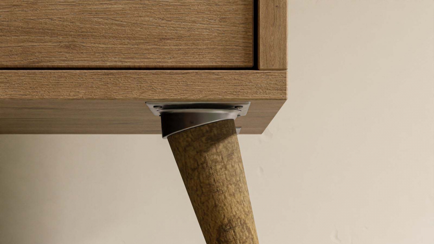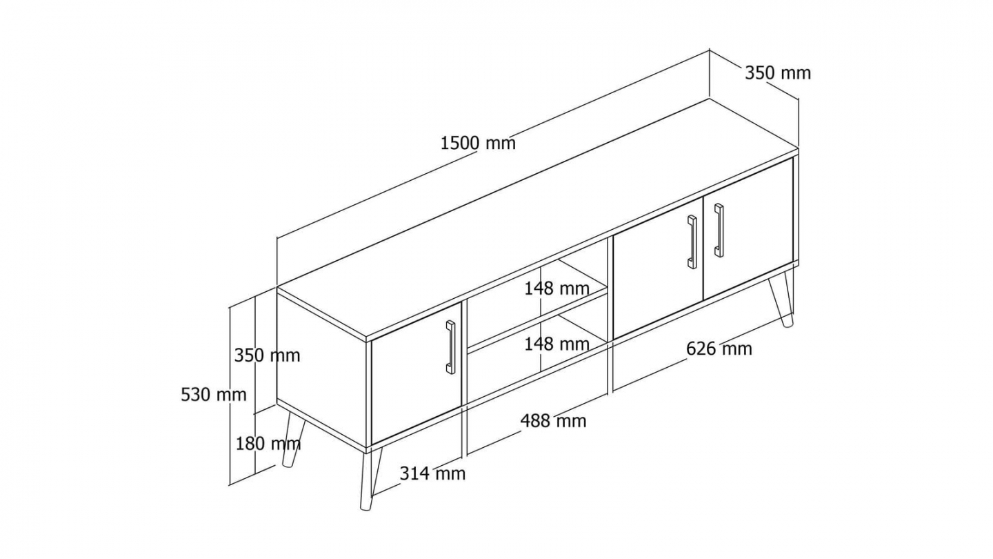 Meuble TV - Porto• Matière : Mélamine, Bois massif• Couleur : Meuble : effet Chêne - Poignées : noir• Design scandinave, alliant pieds fuselés en bois et poignées noires pour un style chaleureux et épuré qui s’intègre facilement à tous les intérieurs.• Piètement en Bois bois• Rangements : 2 niches, 3 portes battantes• Dimensions totales : 150 x 34 x 52...