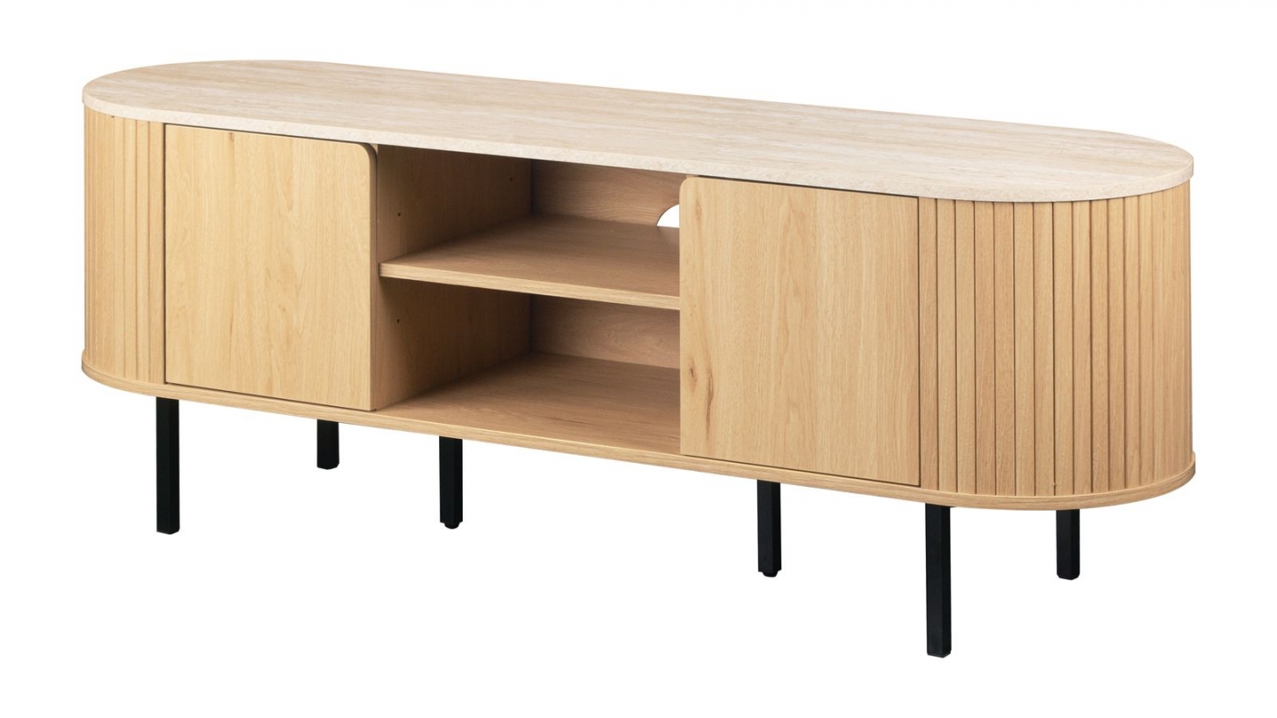 En stockMeuble TV - Juna• Matière : Mélamine• Couleur : Effet chêne et travertin• Meuble au design arrondi. Finitions latérales avec baguettes effet chêne. Plateau supérieur effet travertin.• Piètement en Métal noir• Rangements : 2 niches, 2 portes battantes avec espace de rangement• Dimensions totales : 160 x 40 x 52 cm