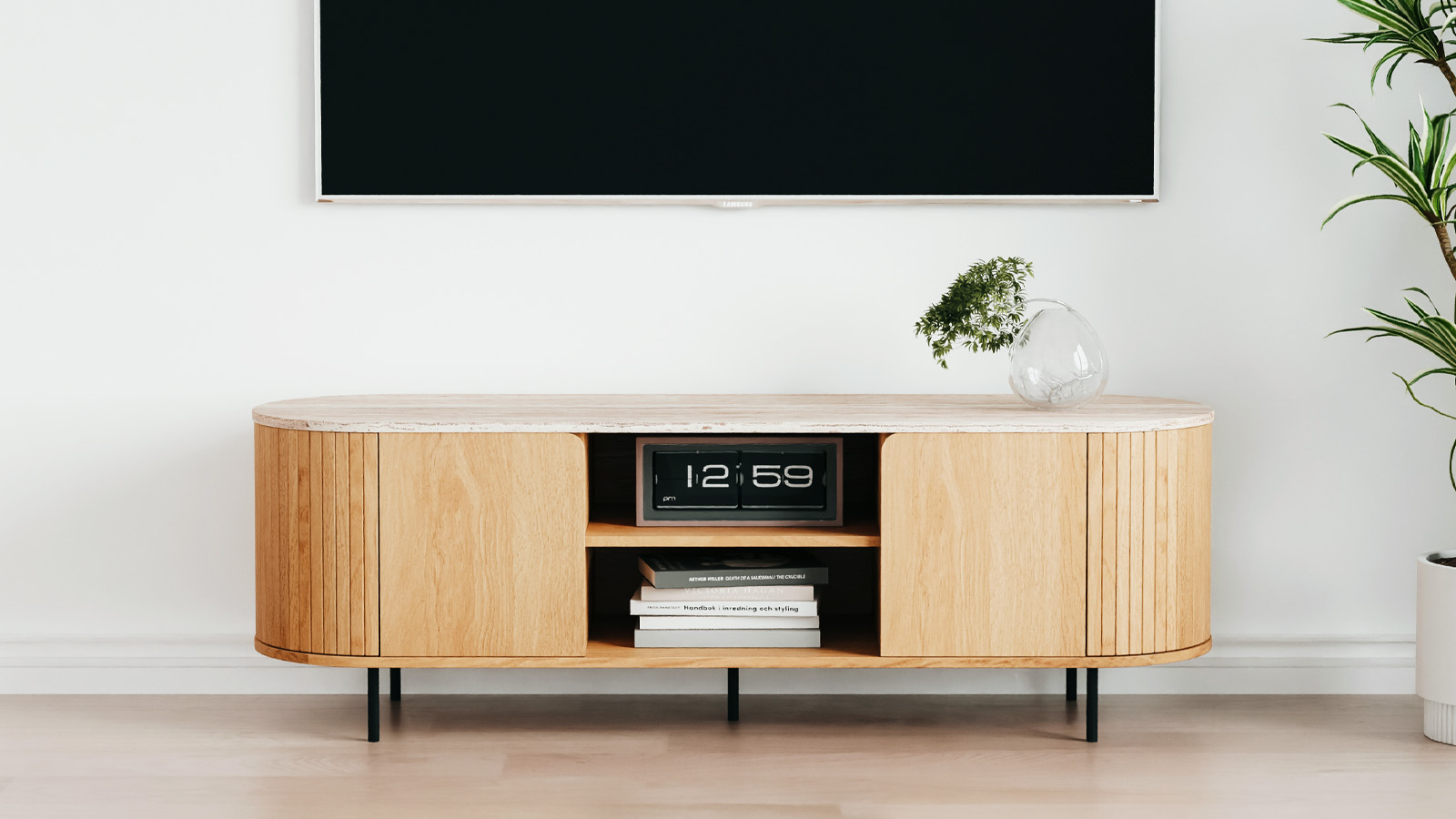 En stockBuffet - Juna• Matière : Mélamine• Couleur : Effet chêne et travertin• Meuble au design arrondi. Finitions latérales avec baguettes effet chêne. Plateau supérieur effet travertin.• Piètement en Métal noir• Rangements : 2 portes battantes avec espace de rangement• Dimensions totales : 120 x 40 x 80 cm