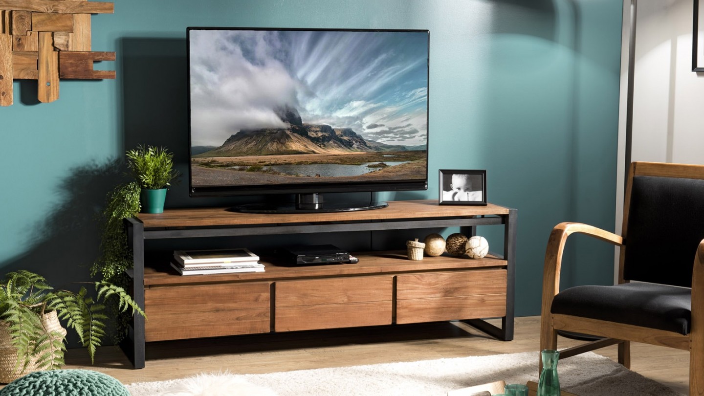 L'aspect brut du bois utilisé pour la fabrication de ce meuble TV est un véritable concentré de caractère. Découvrez sous le plateau 3 tiroirs pour y disposer télécommandes, revues, dvd, petits coussins et toutes affaires que vous voudrez ranger. Pour une ouverture plus simple, les tiroirs sont équipés de railles de chaque côté.
