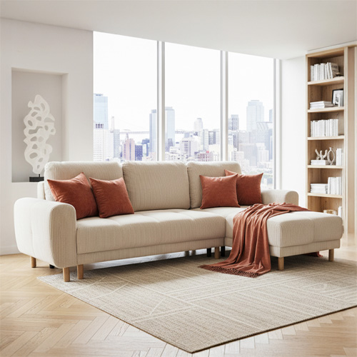 Canapé convertible 3 places en velours côtelé rouille Confort : équilibré : accueil moelleux, soutien ferme Couleur : rouille Revêtement : velours côtelé - certifié Oekotex Coffre de rangement sous l'assise, pratique pour ranger plaid, couettes etc Structure en bois Une assise renforcée avec ressorts métalliques plats pour un meilleur soutien, plus de...