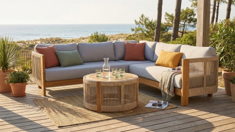 Conçu pour accueillir famille et amis dans un cadre convivial, cet ensemble se compose d'une table basse ronde, d’un fauteuil d’angle et de deux canapés 2 places. Sa structure en bois d’acacia certifié FSC, finition huilée teinte teck, s’associe parfaitement à la corde en polyester tressée pour un rendu à la fois authentique et moderne.