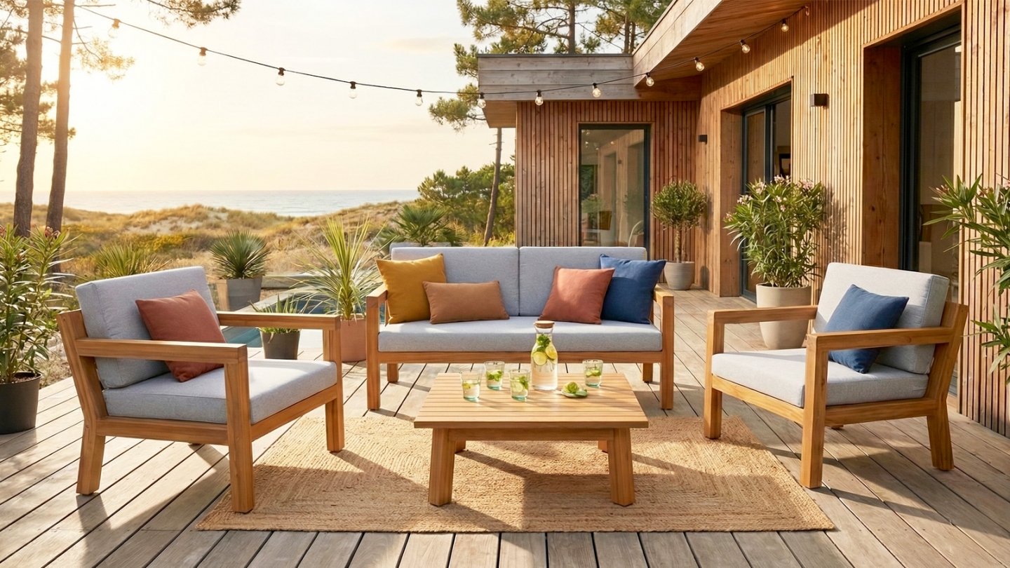 Le bois d’acacia est particulièrement adapté aux salons de jardin grâce à sa robustesse naturelle et sa résistance aux intempéries.
