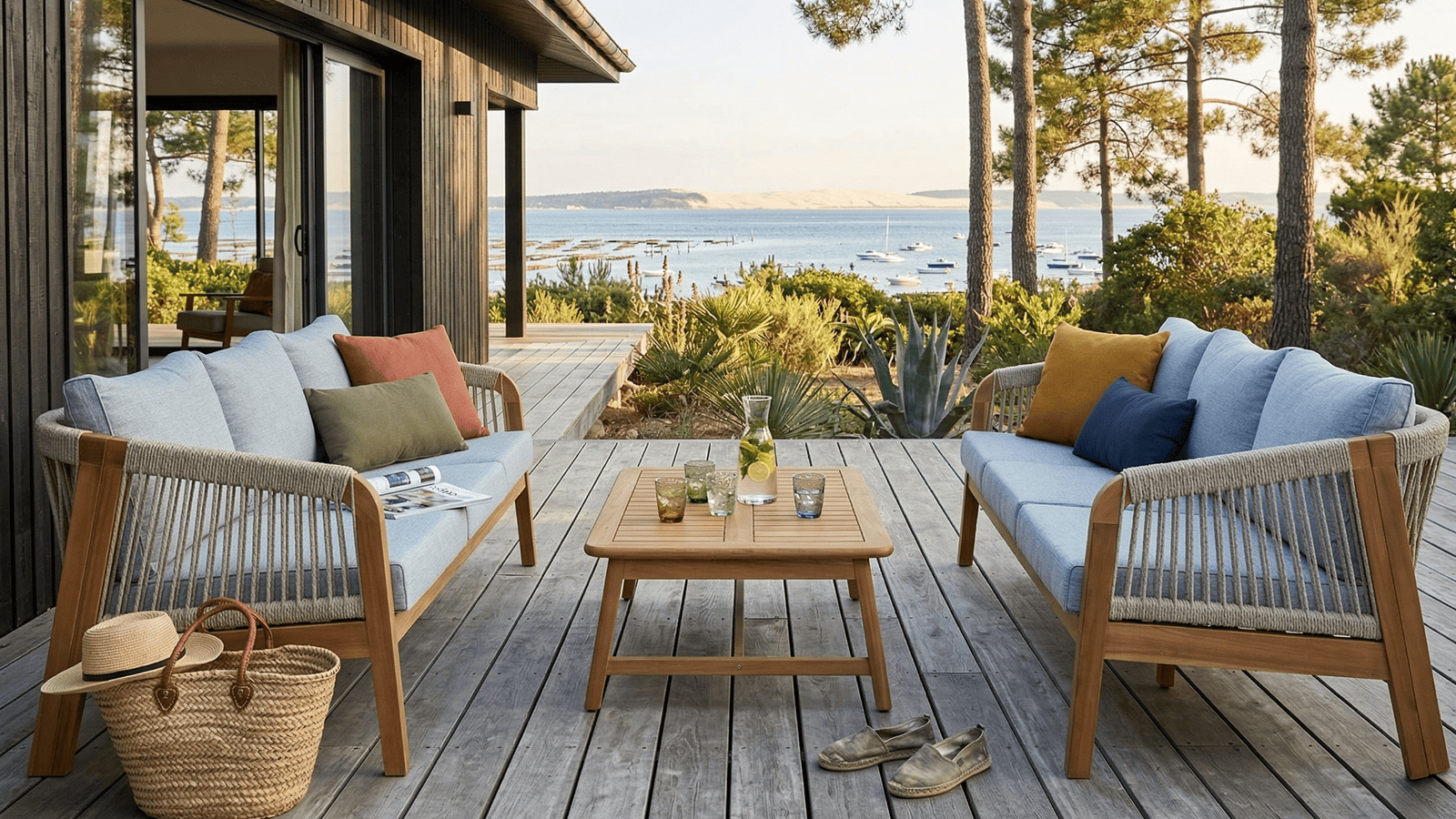 Le bois d’acacia est particulièrement adapté aux salons de jardin grâce à sa robustesse naturelle et sa résistance aux intempéries.