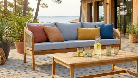 Ajoutez une touche d’élégance et de convivialité à votre extérieur avec le canapé de jardin 3 places Symi et sa table basse. Fabriqué en bois certifié FSC, ce canapé garantit une solidité à toute épreuve tout en respectant l’environnement. Sa structure robuste est spécialement conçue pour résister aux variations climatiques, vous assurant ainsi une longévité optimale saison après saison.