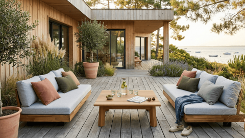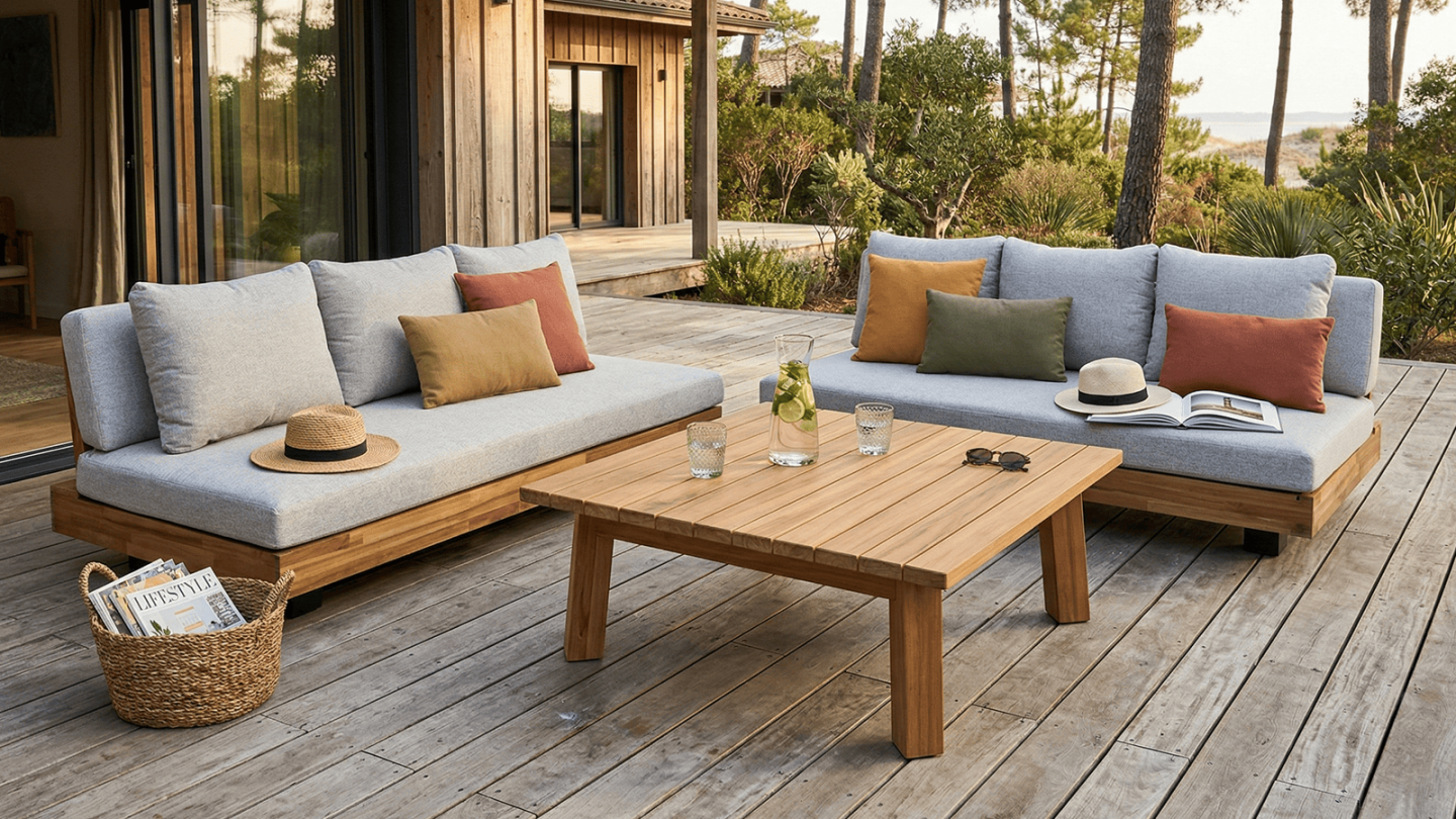 Le bois d’acacia est particulièrement adapté aux salons de jardin grâce à sa robustesse naturelle et sa résistance aux intempéries.