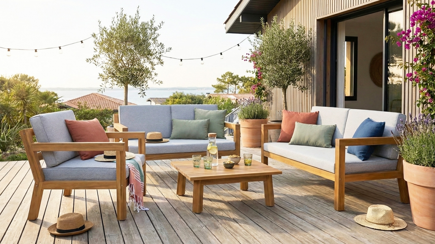 Le bois d’acacia est particulièrement adapté aux salons de jardin grâce à sa robustesse naturelle et sa résistance aux intempéries.