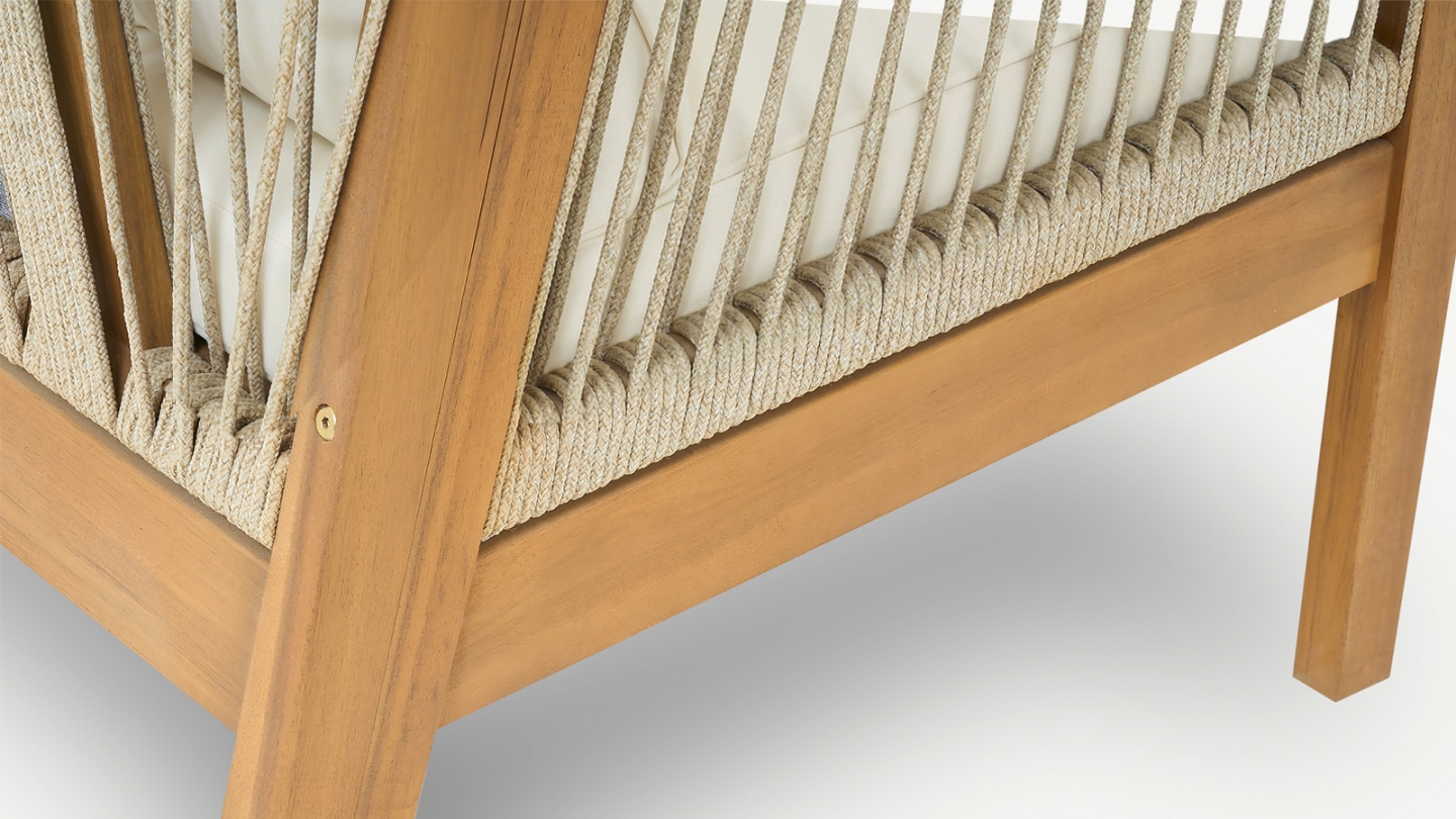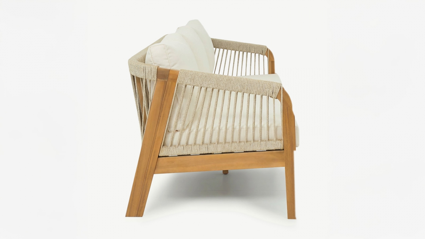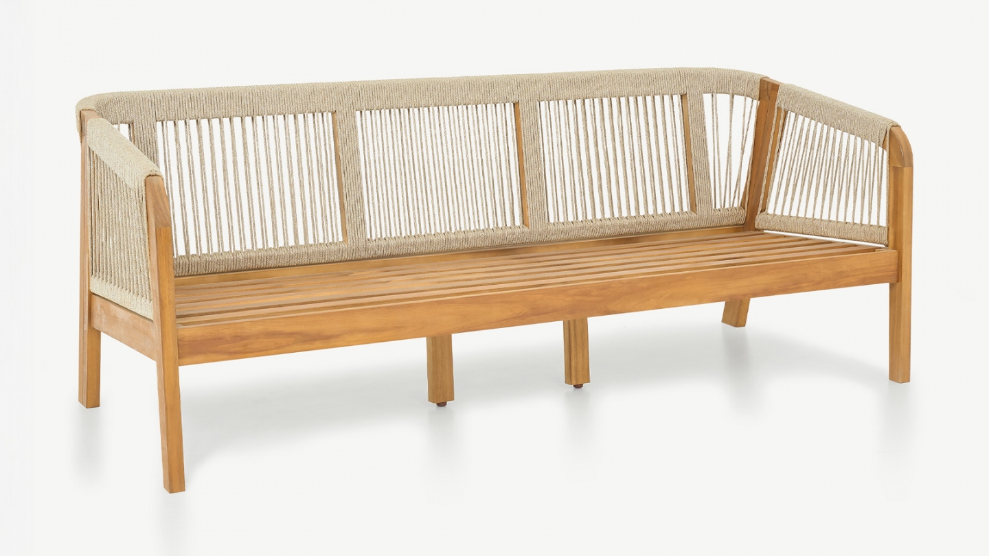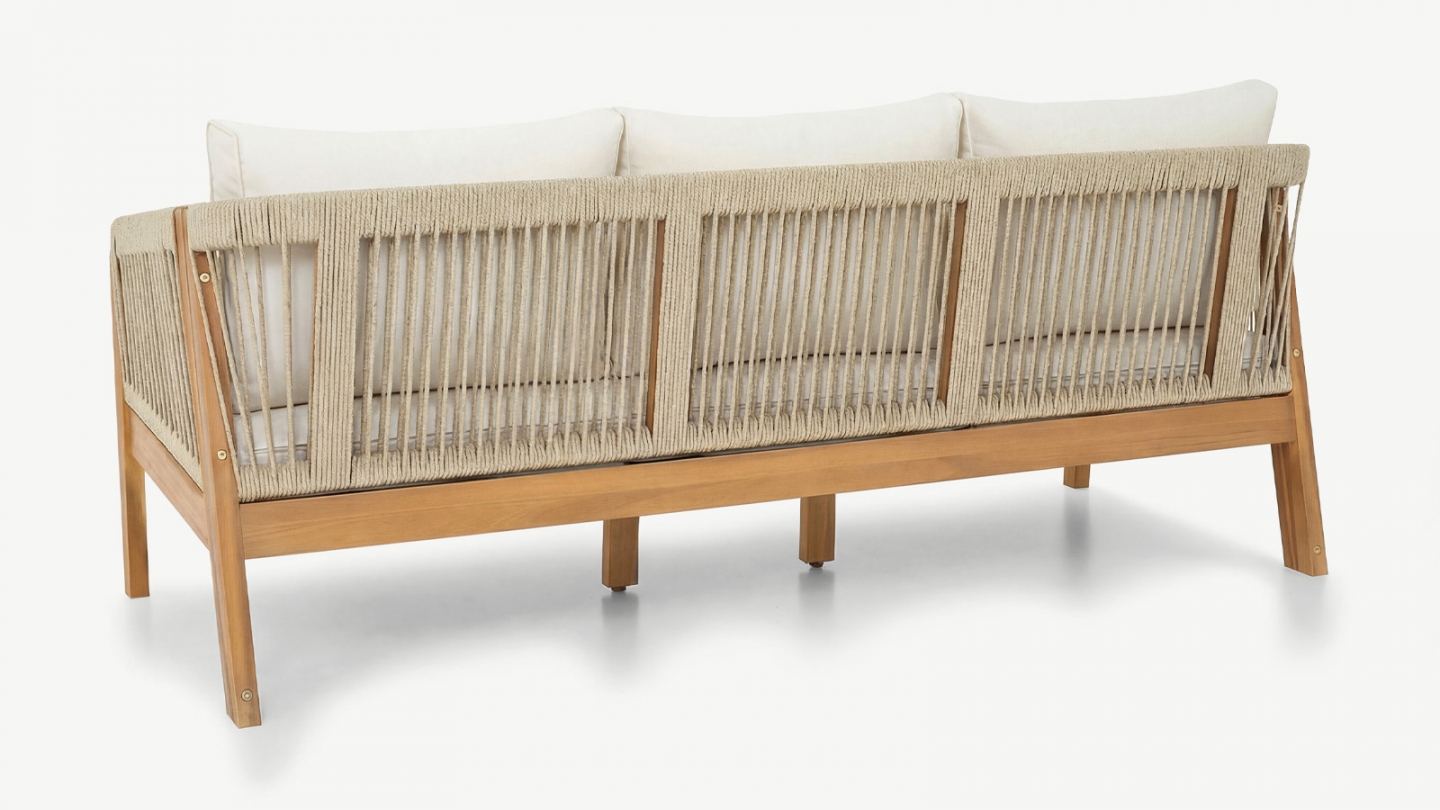 Canapé de jardin - Symi • Nombre de places : 3 • Structure : Bois d'acacia FSC, finition huilée, couleur teck Le bois d’acacia est particulièrement adapté aux salons de jardin grâce à sa robustesse naturelle et sa résistance aux intempéries. • Détails design : Corde en polyester élégante et résistante • Protection : La finition huilée protège contre...