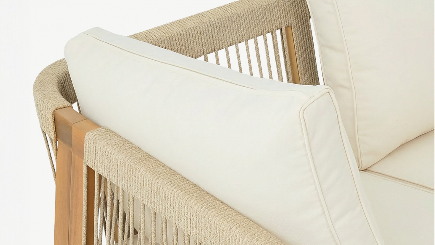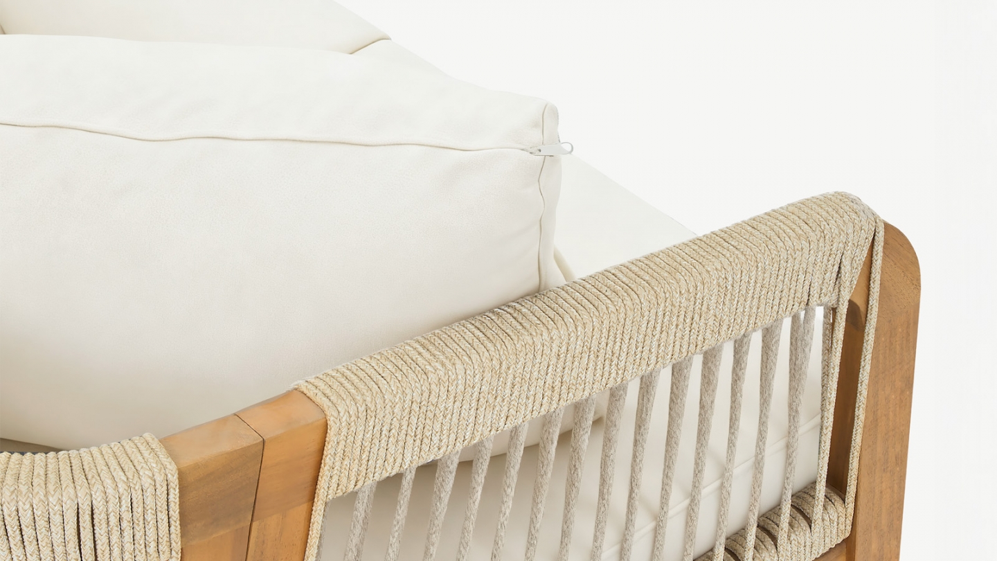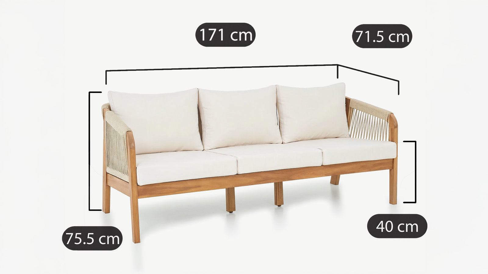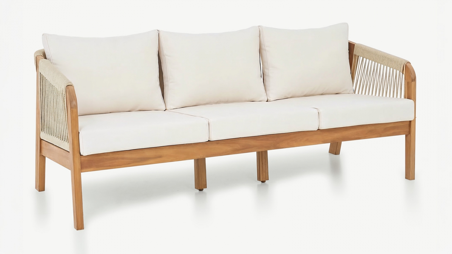 Canapé de jardin - Symi • Nombre de places : 3 • Structure : Bois d'acacia FSC, finition huilée, couleur teck Le bois d’acacia est particulièrement adapté aux salons de jardin grâce à sa robustesse naturelle et sa résistance aux intempéries. • Détails design : Corde en polyester élégante et résistante • Protection : La finition huilée protège contre...