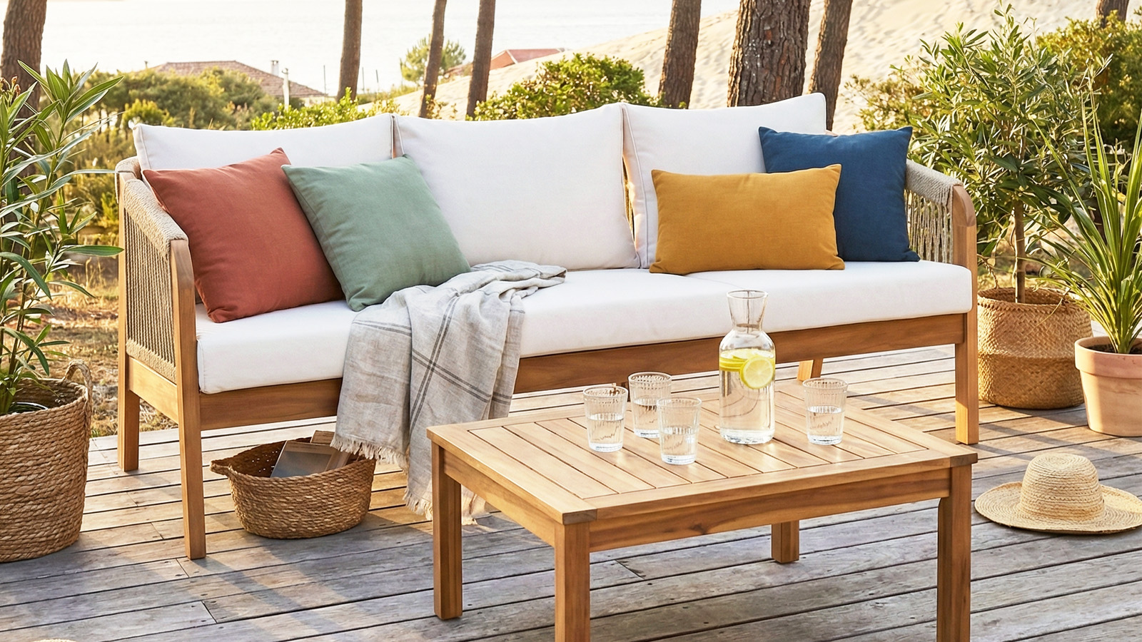 Le bois d’acacia est particulièrement adapté aux salons de jardin grâce à sa robustesse naturelle et sa résistance aux intempéries.