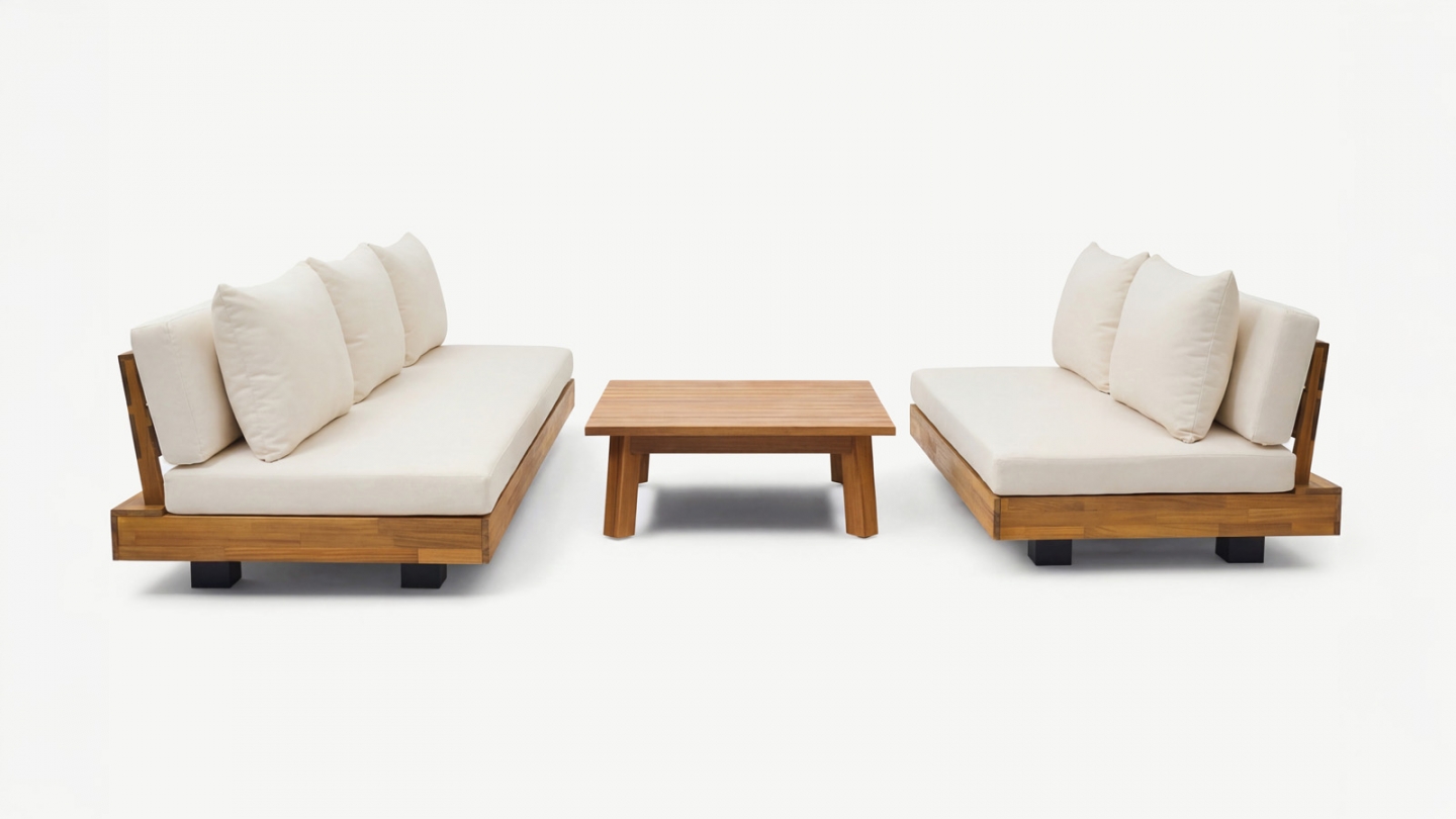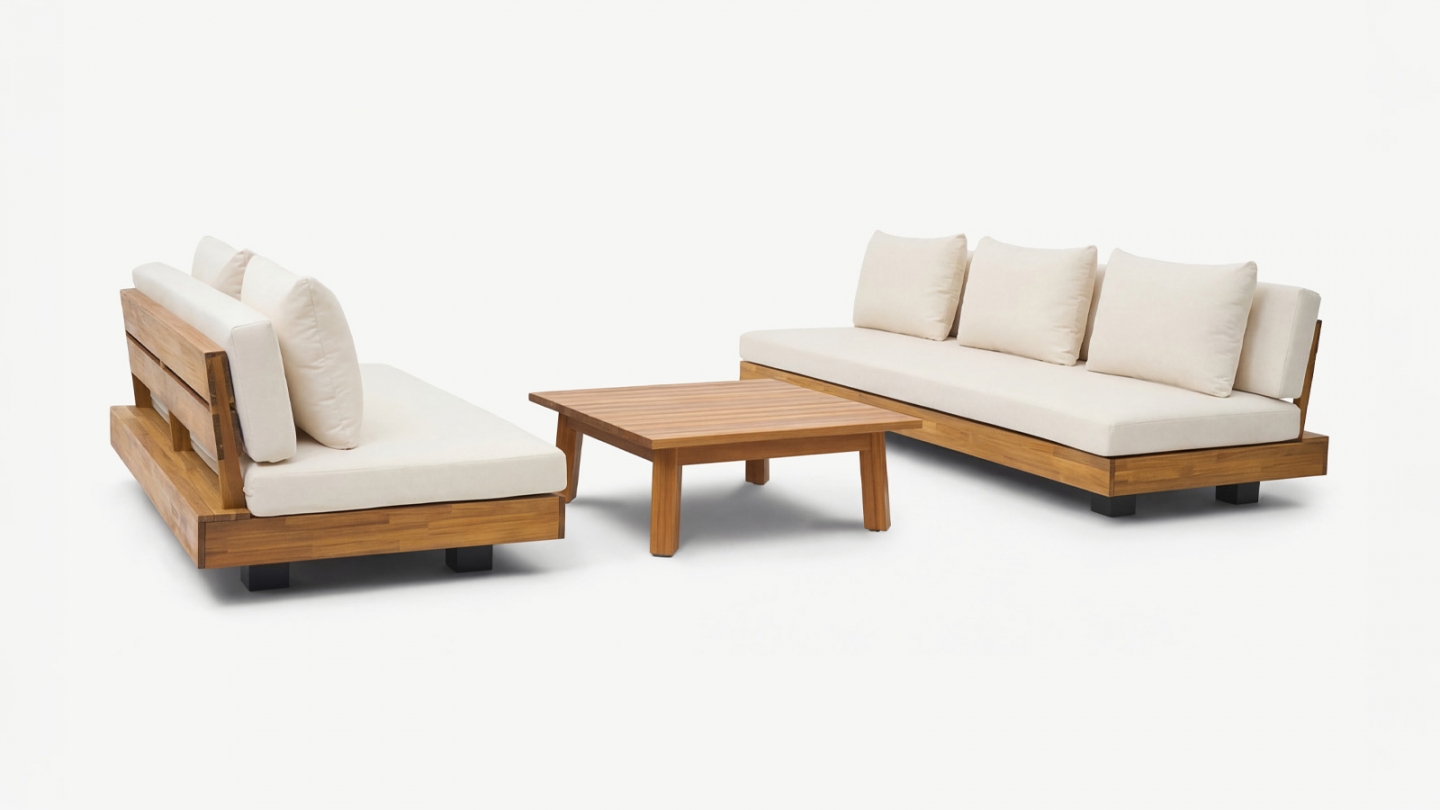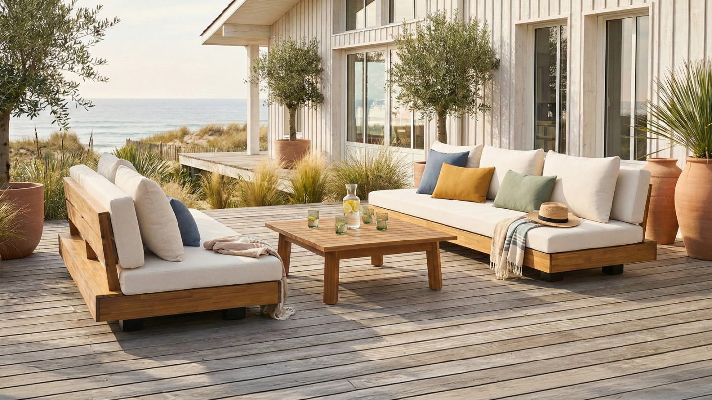 Le bois d’acacia est particulièrement adapté aux salons de jardin grâce à sa robustesse naturelle et sa résistance aux intempéries.