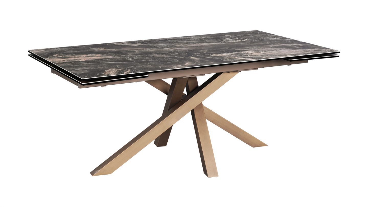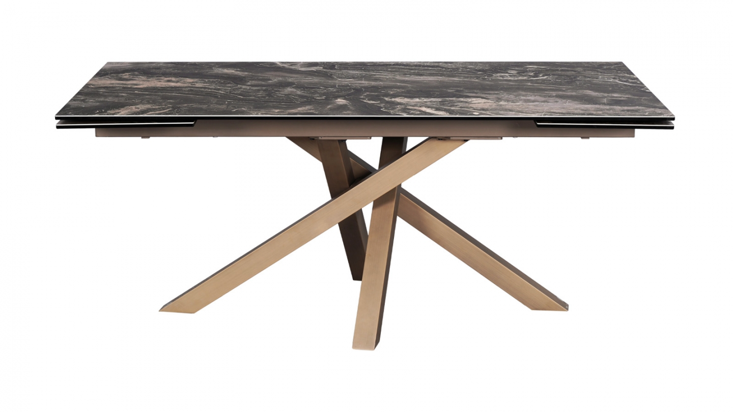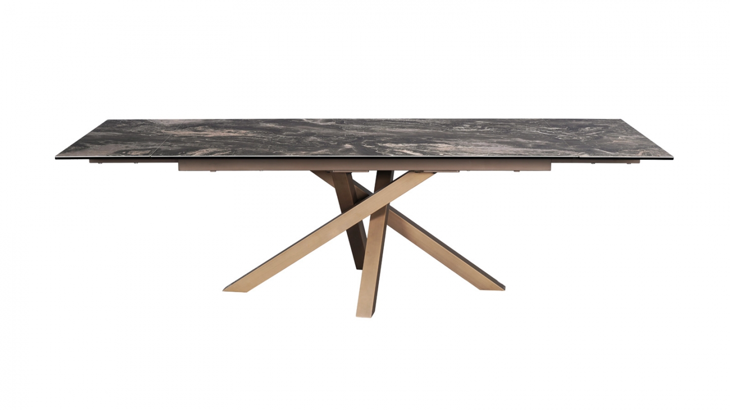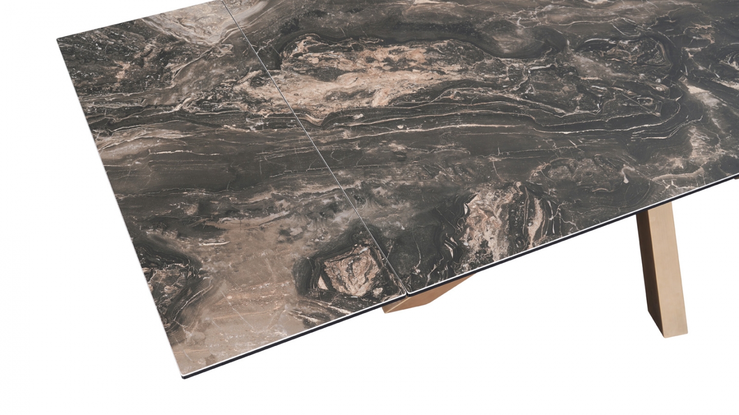 Grande tablée, grand style. La table Molina accueille jusqu'à 10 convives grâce à ses 2 allonges latérales sur rail, le tout habillé d'une céramique effet marbre brun Emperador sur piètement bronze.