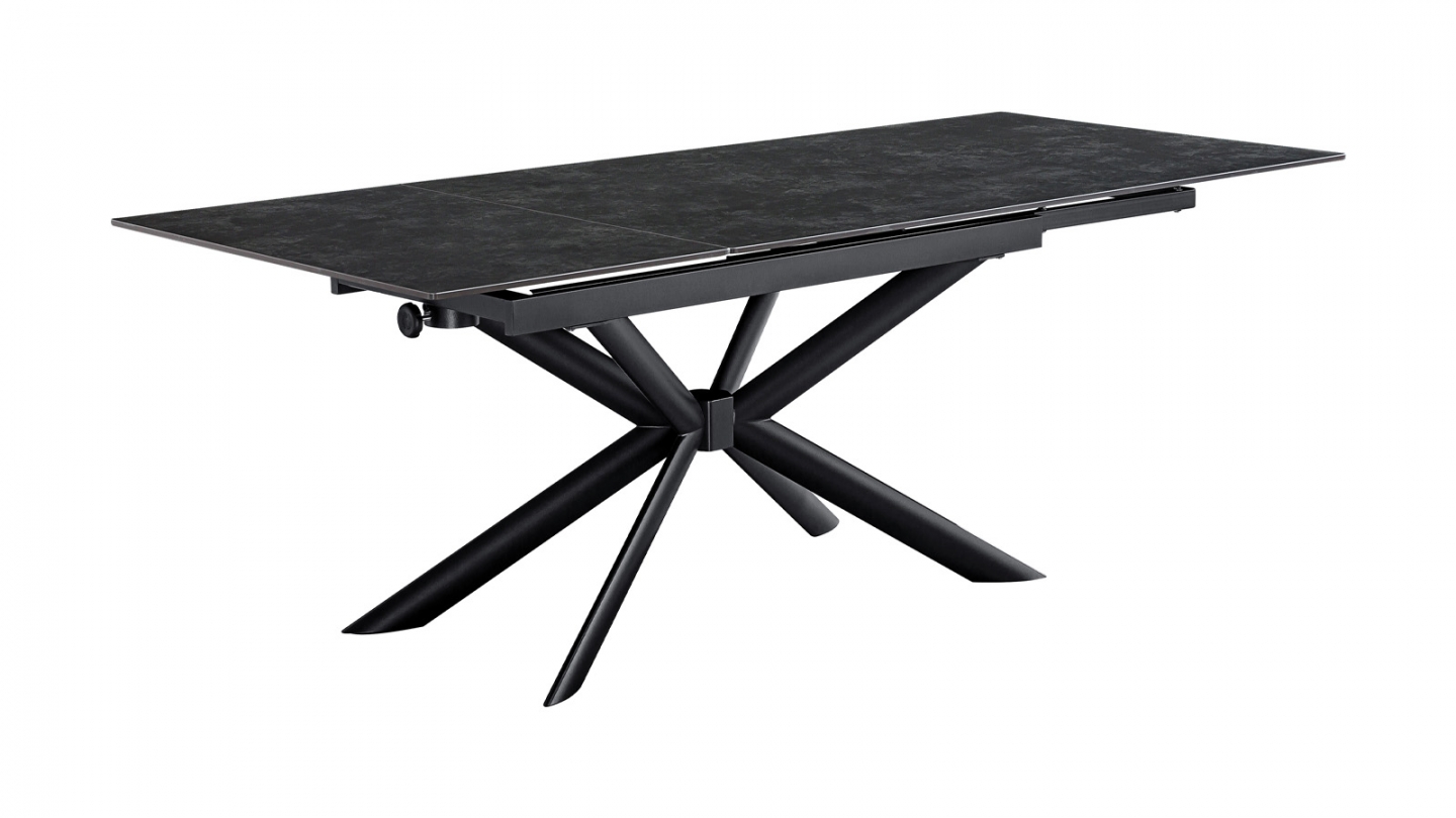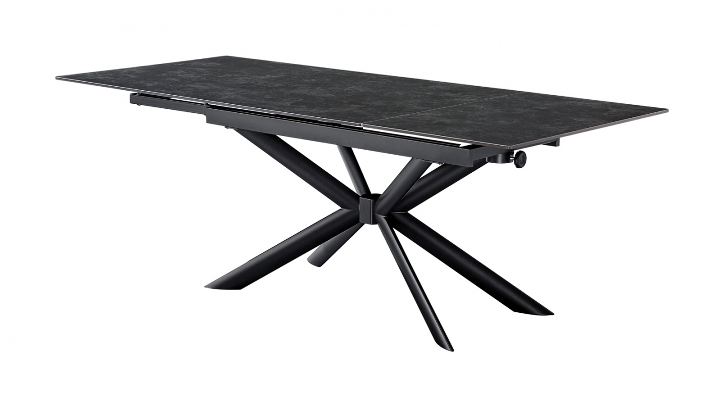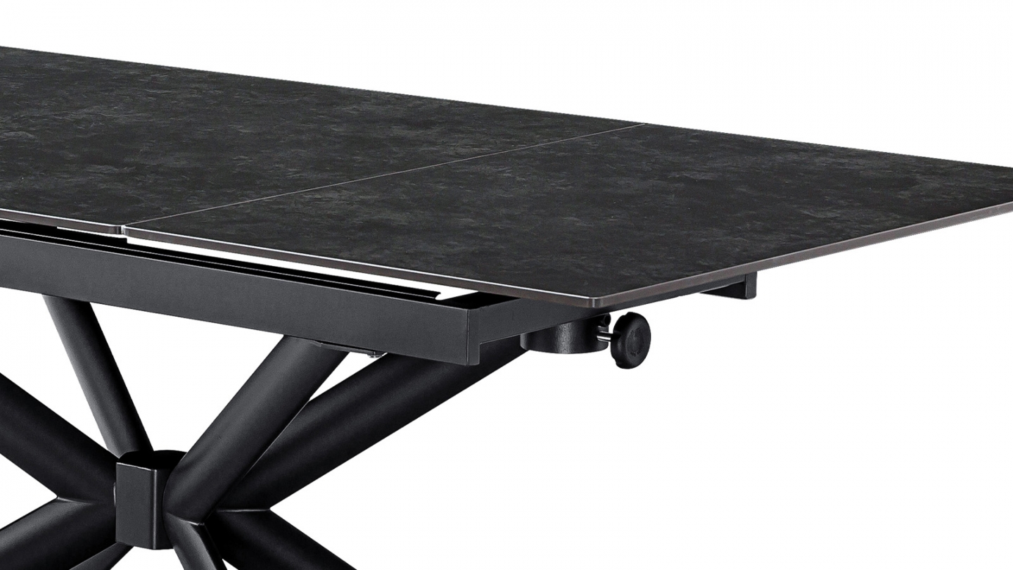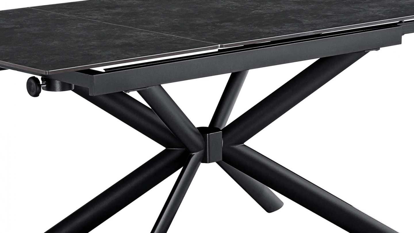 Sobre, puissante, extensible à l'extrême. La table Vik offre jusqu'à 290 cm de table grâce à ses 2 allonges sur rail, avec un plateau céramique gris anthracite sur piètement étoile noir.