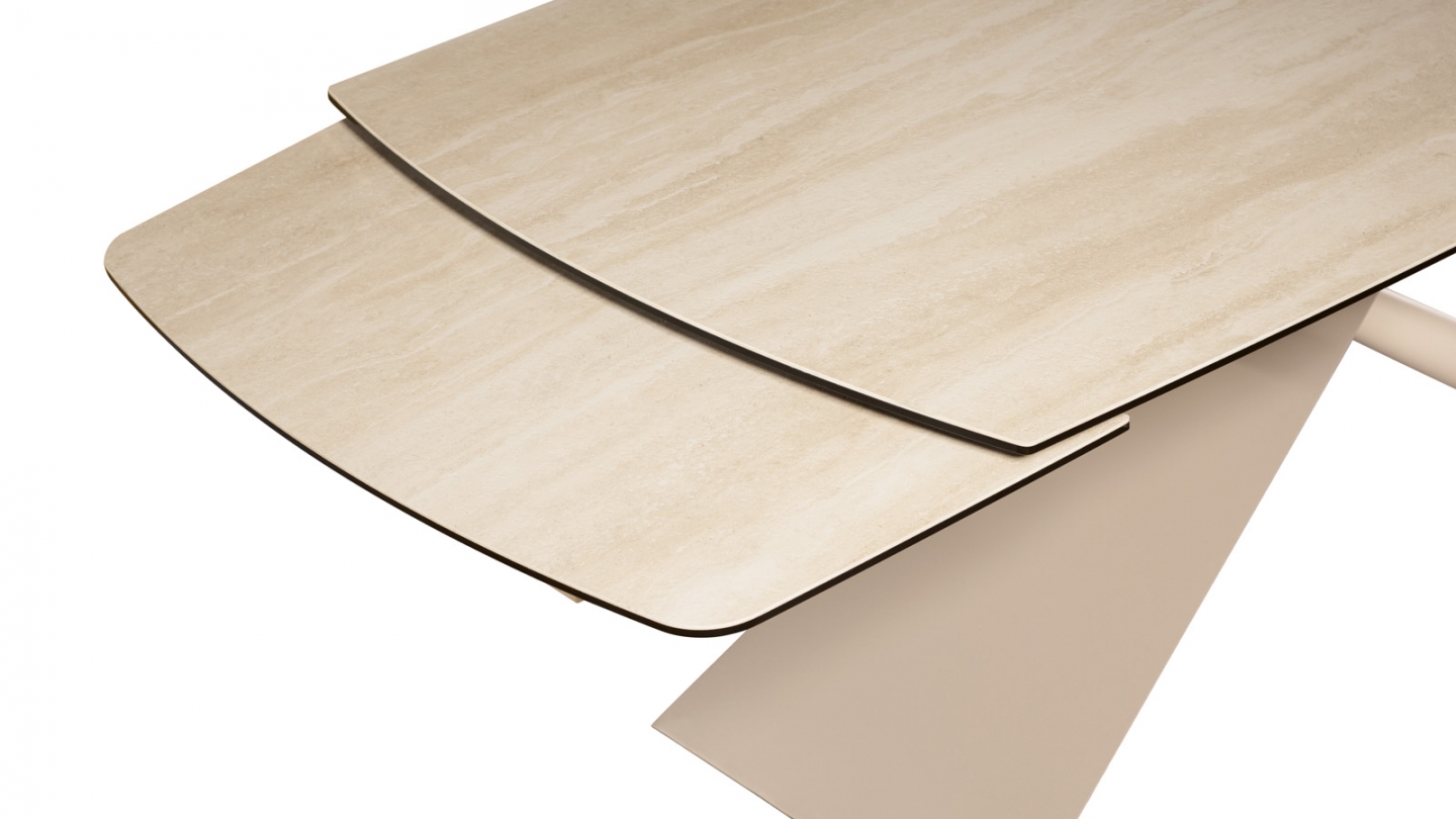 Teintes naturelles et matière céramique pour une table à manger intemporelle. La table Tundra s'étend de 180 à 260 cm grâce à ses 2 allonges sur rail, avec un plateau effet travertin aux extrémités arrondies.